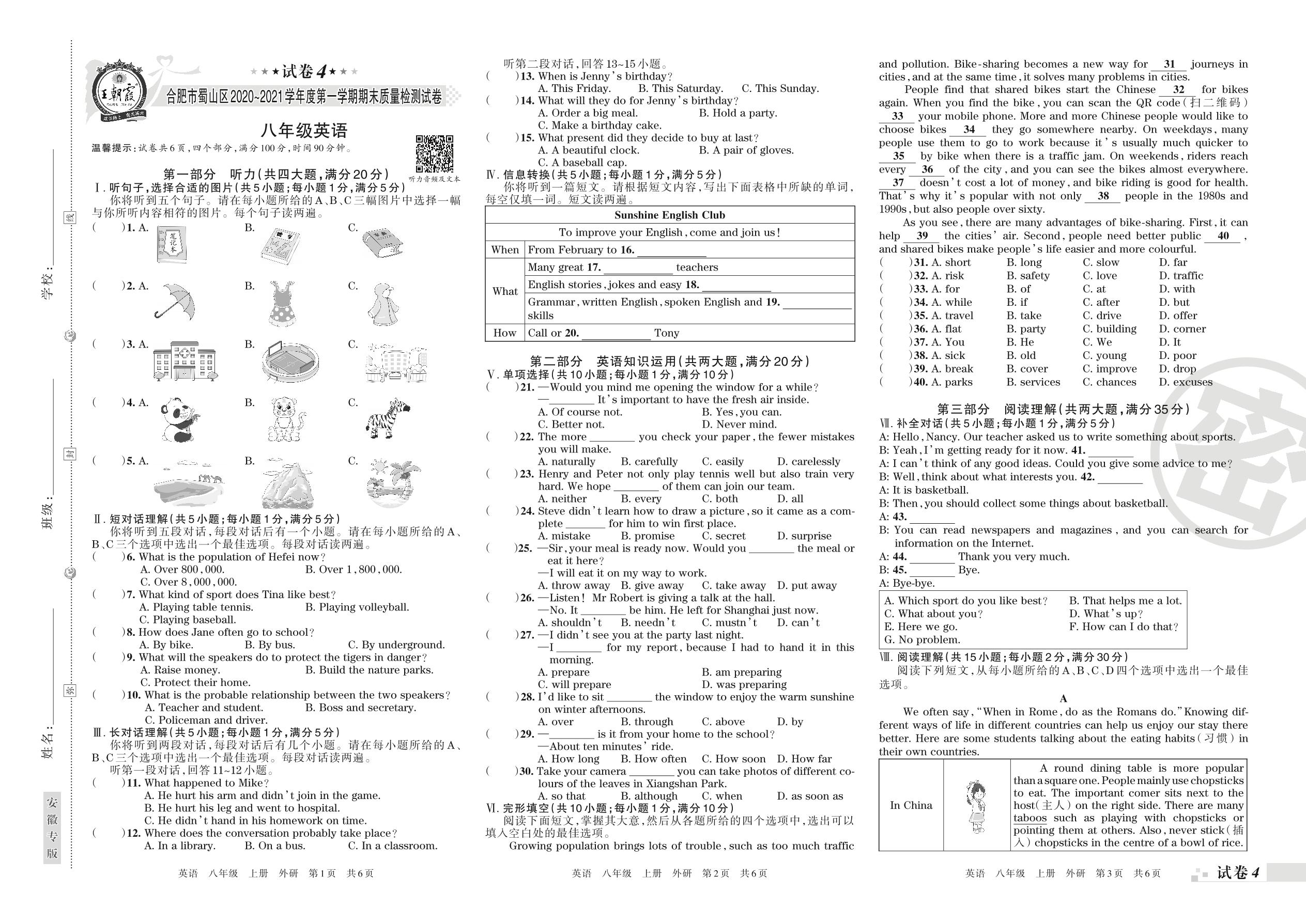 合肥市蜀山区2020~2021学年度第一学期期末质量检测试卷 八年级英语(外研版)_R211223145240584【4】