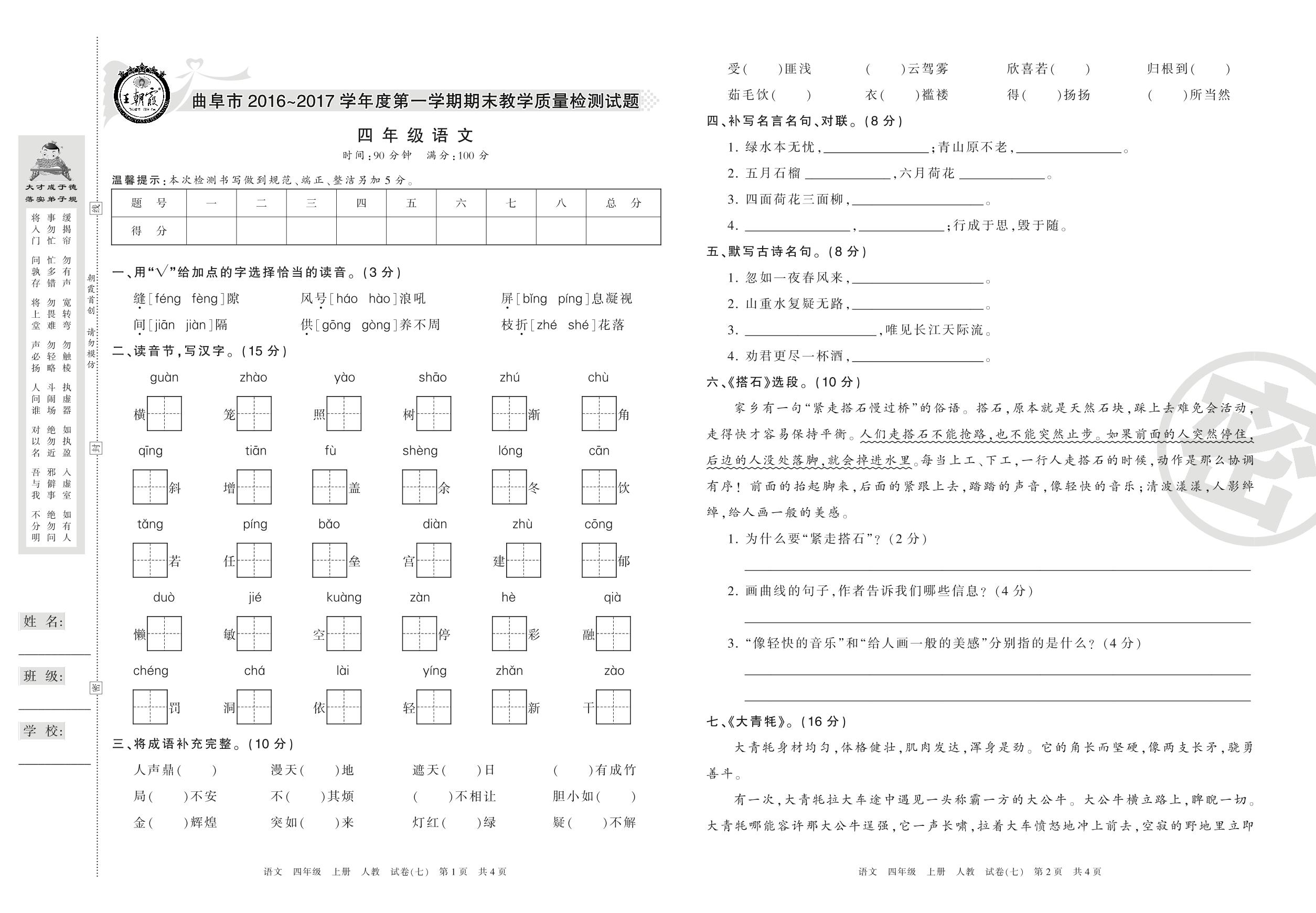2016-2017学年第一学期曲阜市四年级语文试卷(人教版)【7】