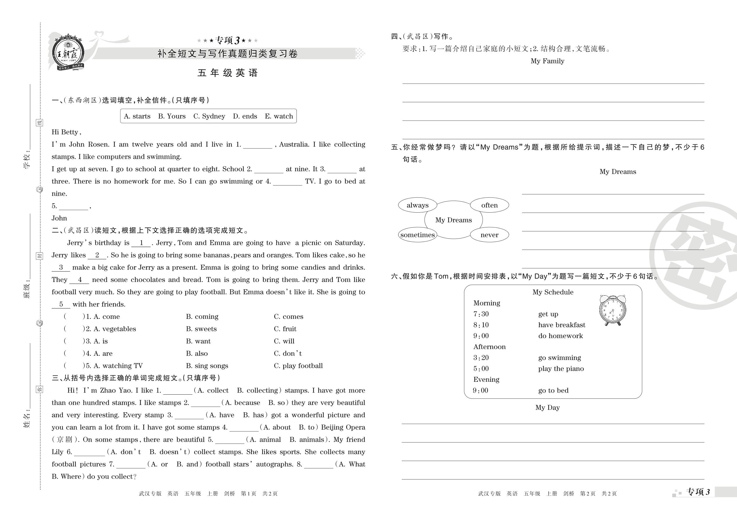 王朝霞期末专项卷——补全短文与写作真题归类复习卷五年级上册英语(剑桥版)【3】