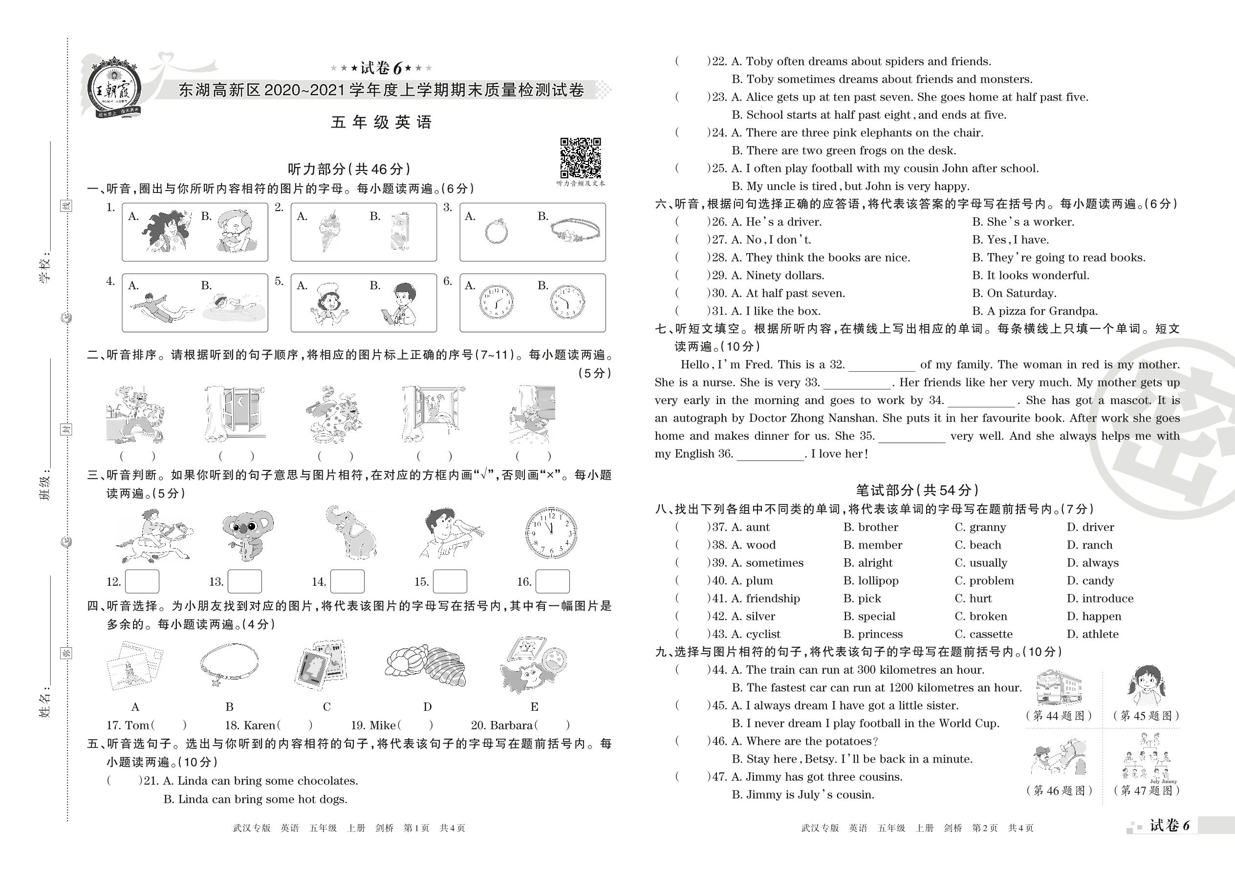 东湖高新区2020~2021学年度上学期期末质量检测试卷五年级英语(剑桥版)【6】