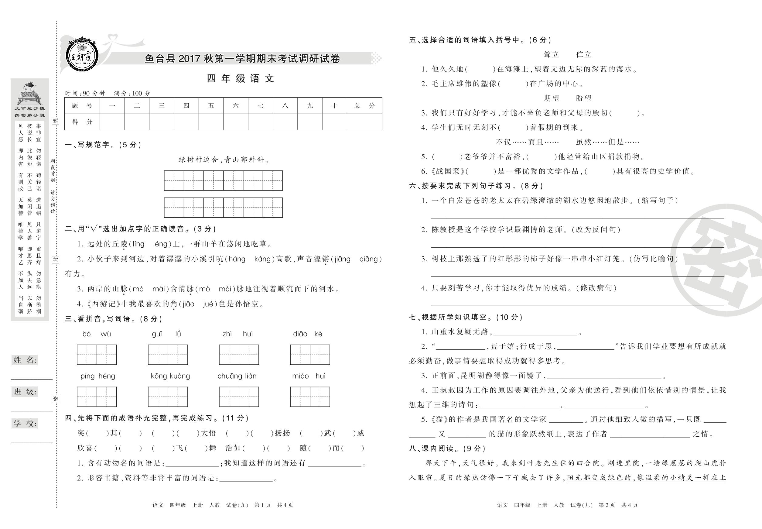 2016-2017学年第一学期济宁市鱼台县四年级语文试卷(人教版)【9】