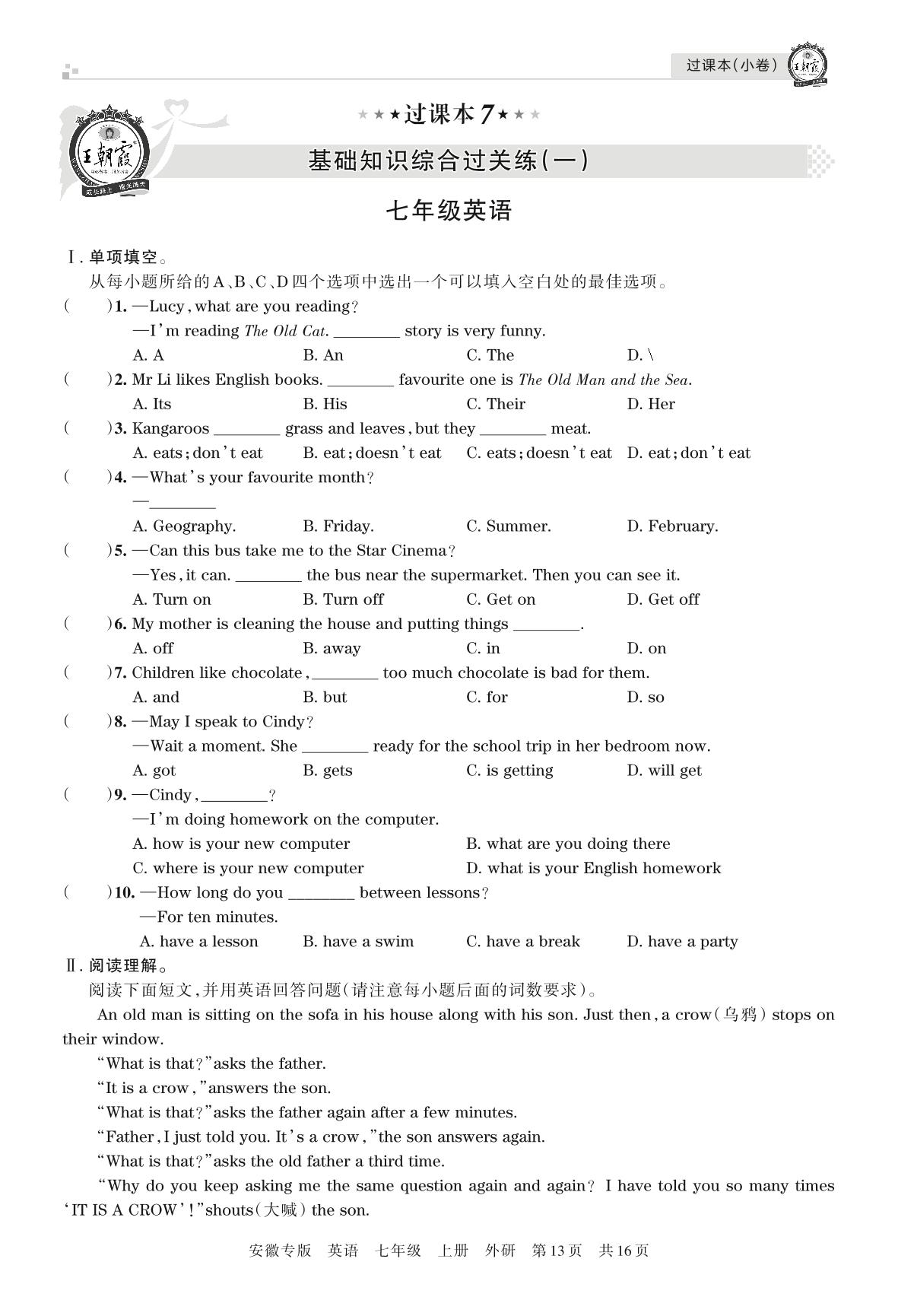 王朝霞期末过课本——基础知识综合过关练(一)七年级上册英语(外研版)【7】
