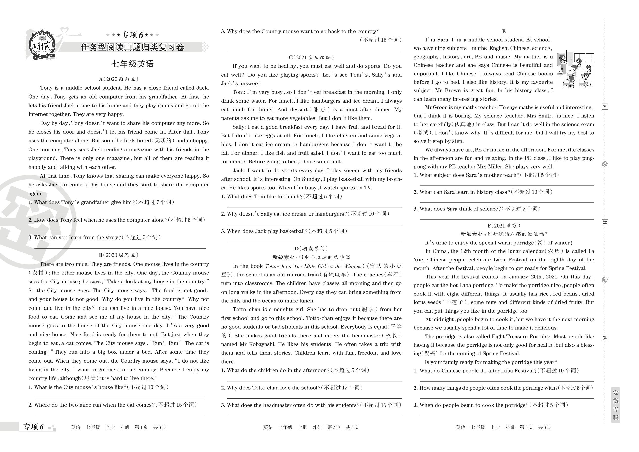 王朝霞期末专项卷——任务型阅读真题归类复习卷七年级上册英语(外研版)【6】