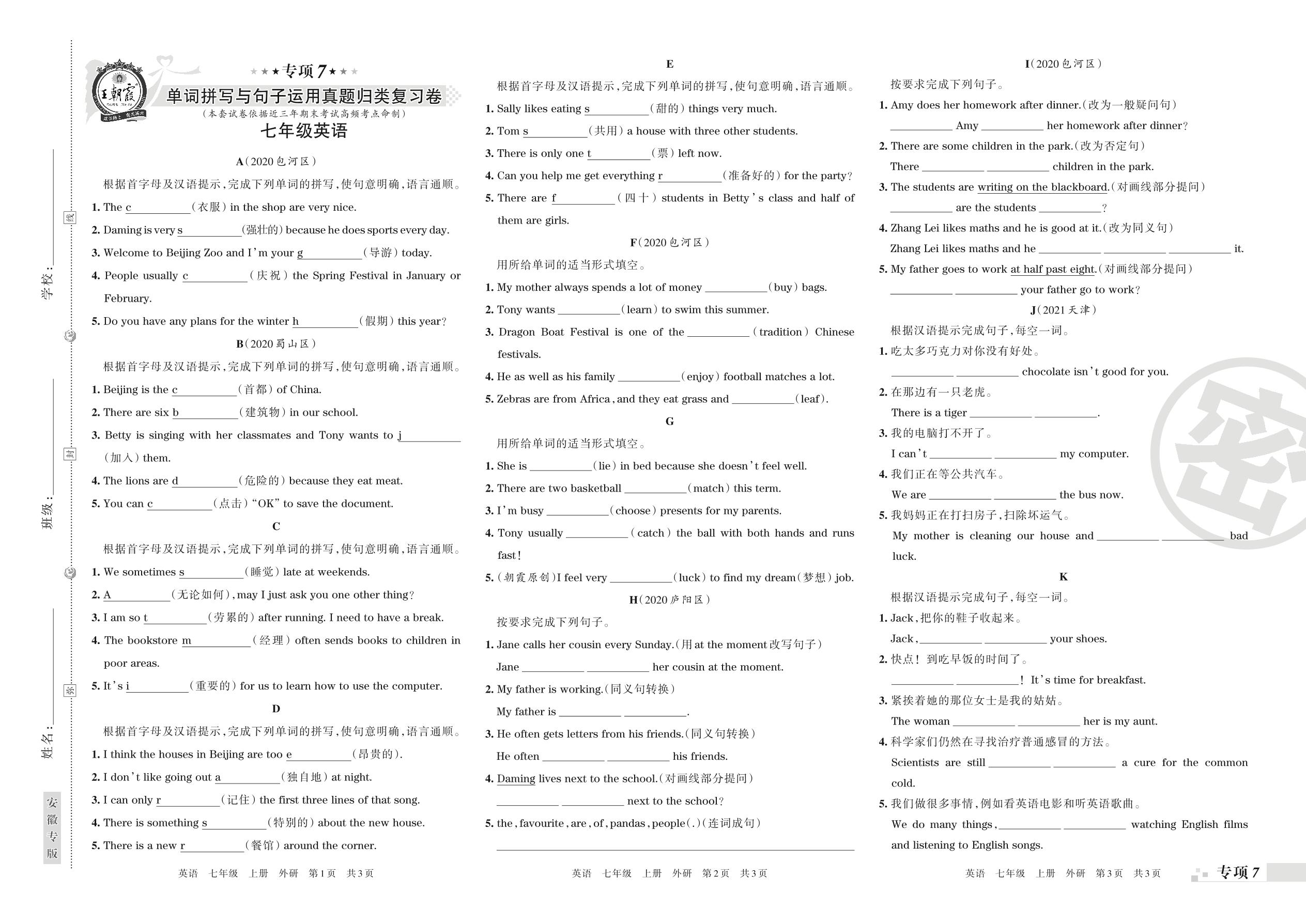 王朝霞期末专项卷——单词拼写与句子运用真题归类复习卷七年级上册英语(外研版)【7】