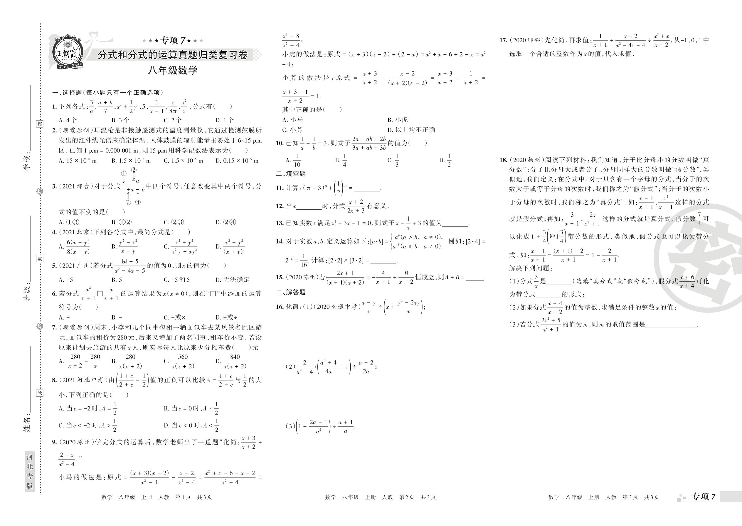 王朝霞期末专项卷——分式和分式的运算真题归类复习卷八年级上册数学(人教版)【7】