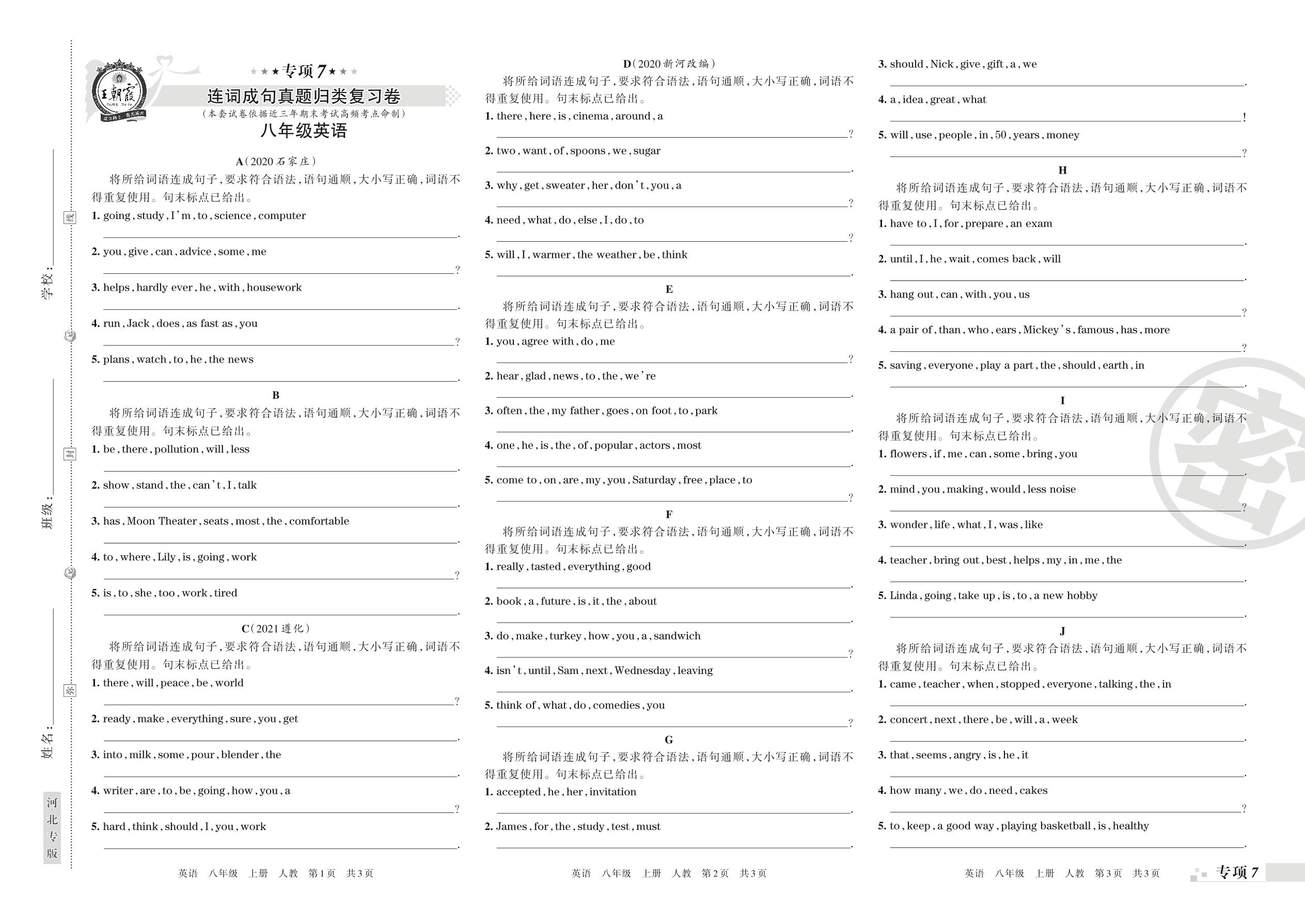 王朝霞期末专项卷——连词成句真题归类复习卷八年级上册英语(人教版)【7】