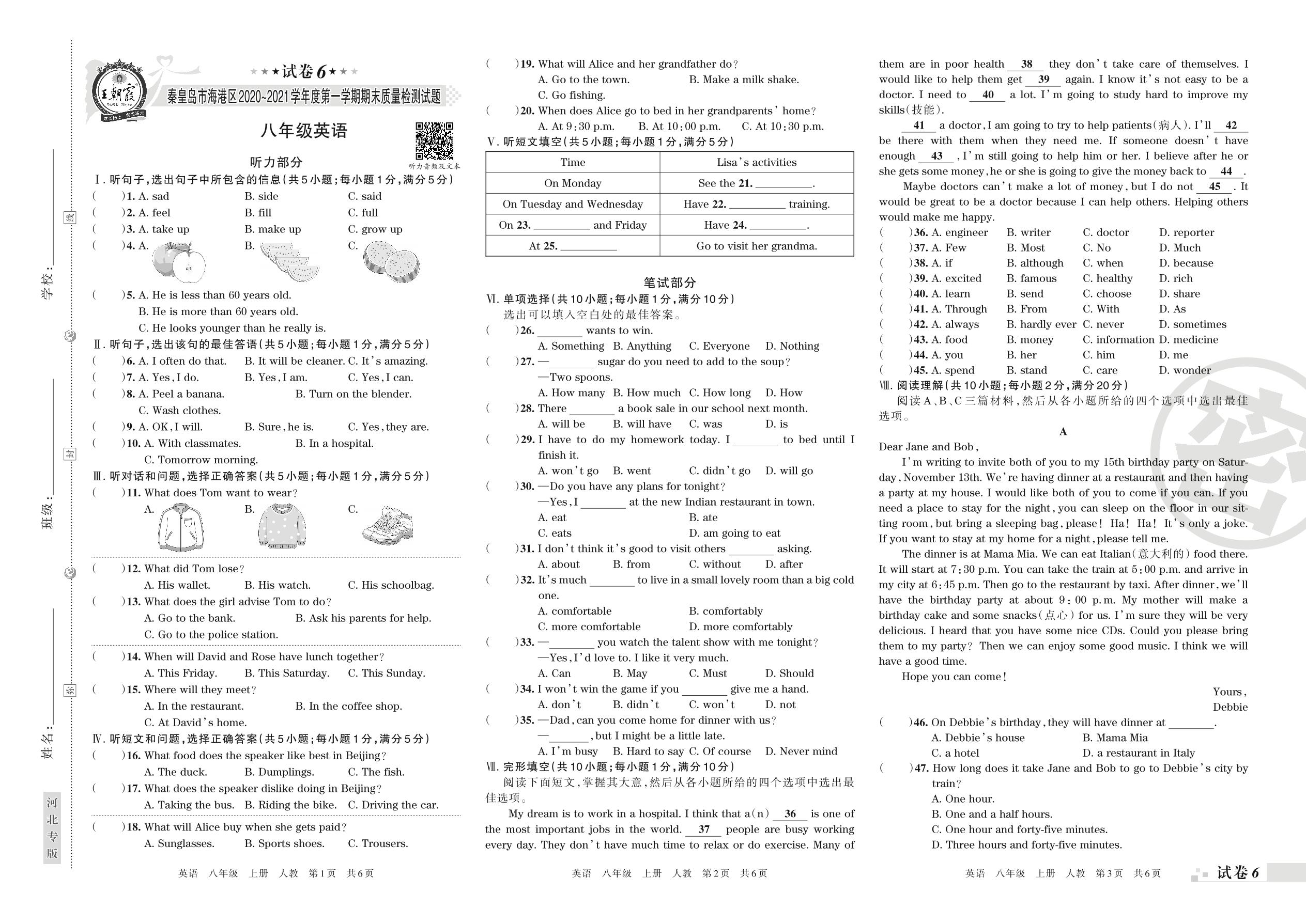 秦皇岛市海港区2020~2021学年度第一学期期末质量检测试题八年级英语(人教版)【6】