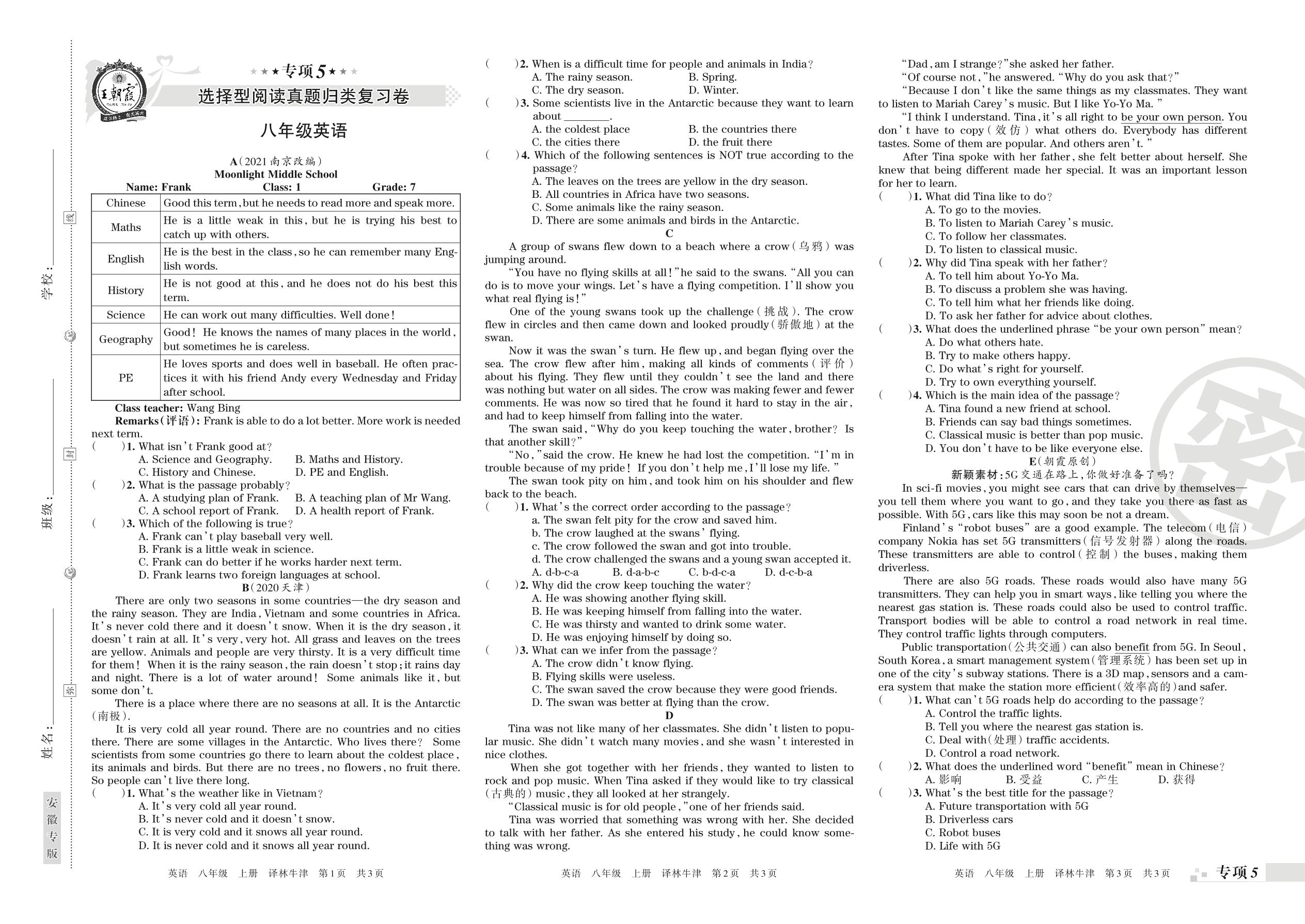 王朝霞期末专项卷——选择型阅读真题归类复习卷八年级上册英语(译林牛津版)【5】