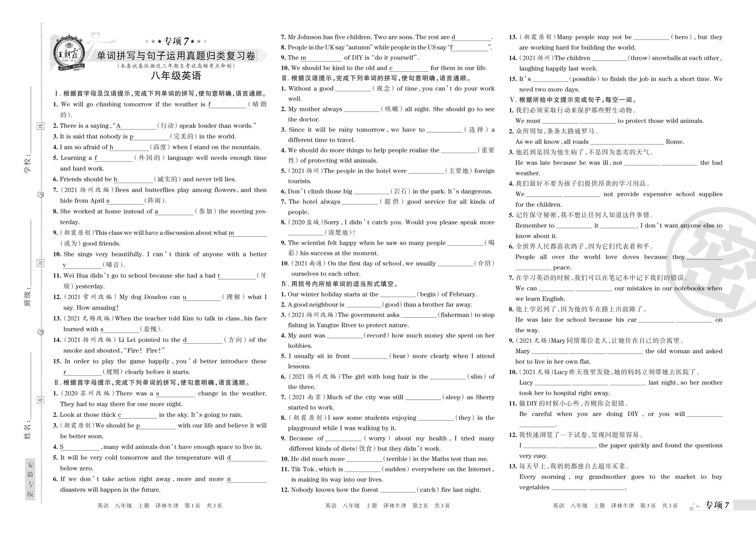 王朝霞期末专项卷——单词拼写与句子运用真题归类复习卷八年级上册英语(译林牛津版)【7】