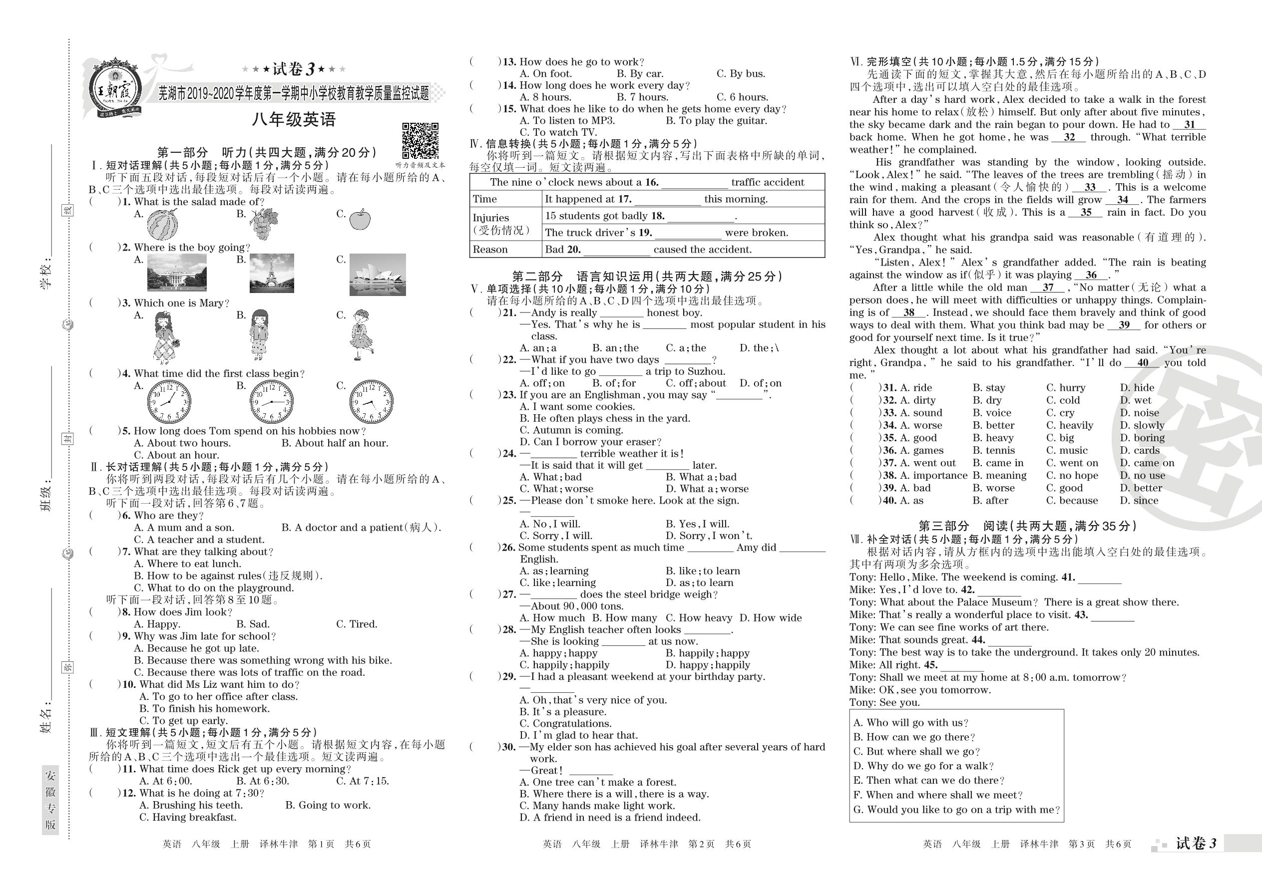 芜湖市2019~2020学年度第一学期中小学校教育教学质量监控试题八年级英语(译林牛津版)【3】