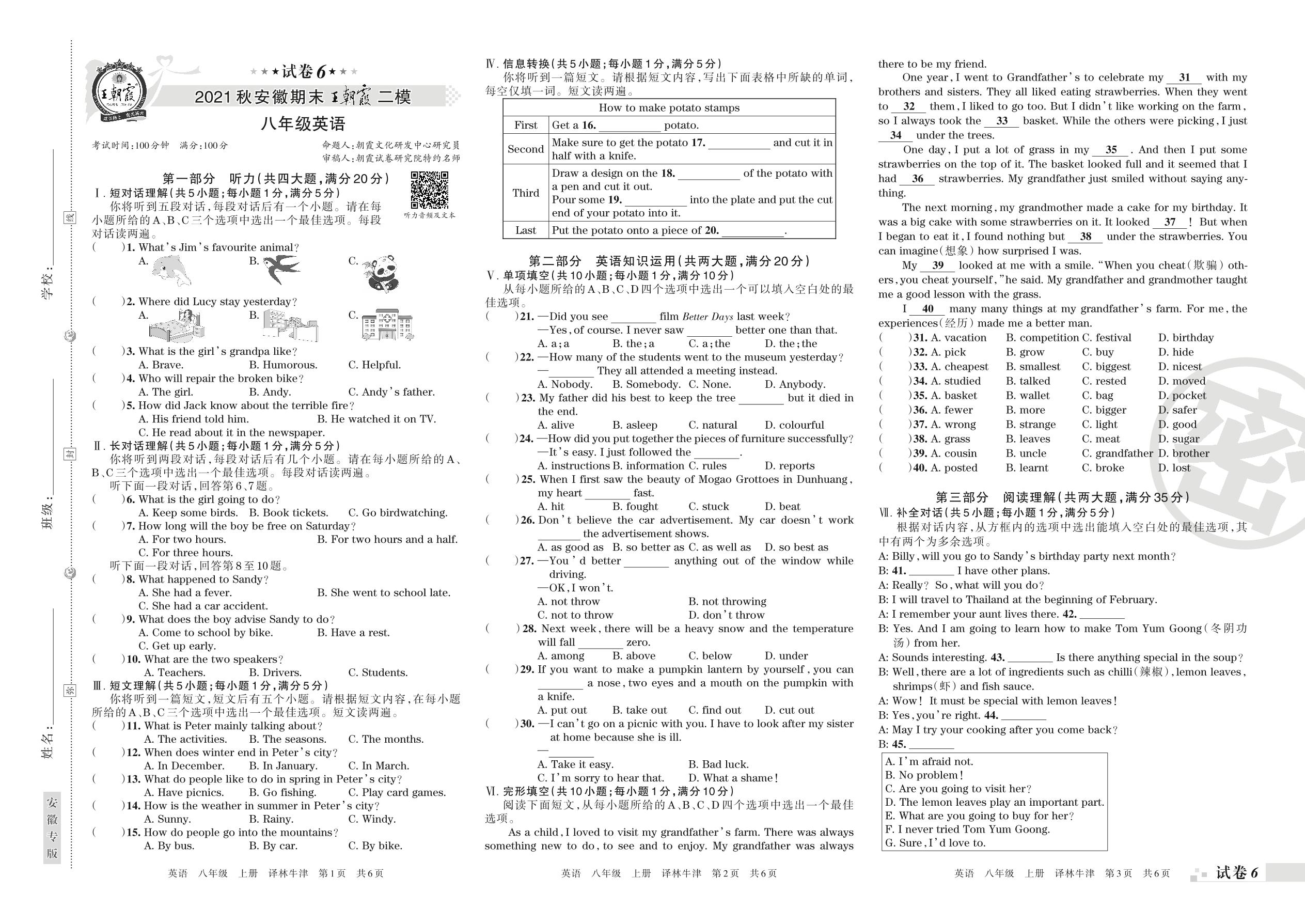 王朝霞期末模拟卷八年级上册英语(译林牛津版)【6】
