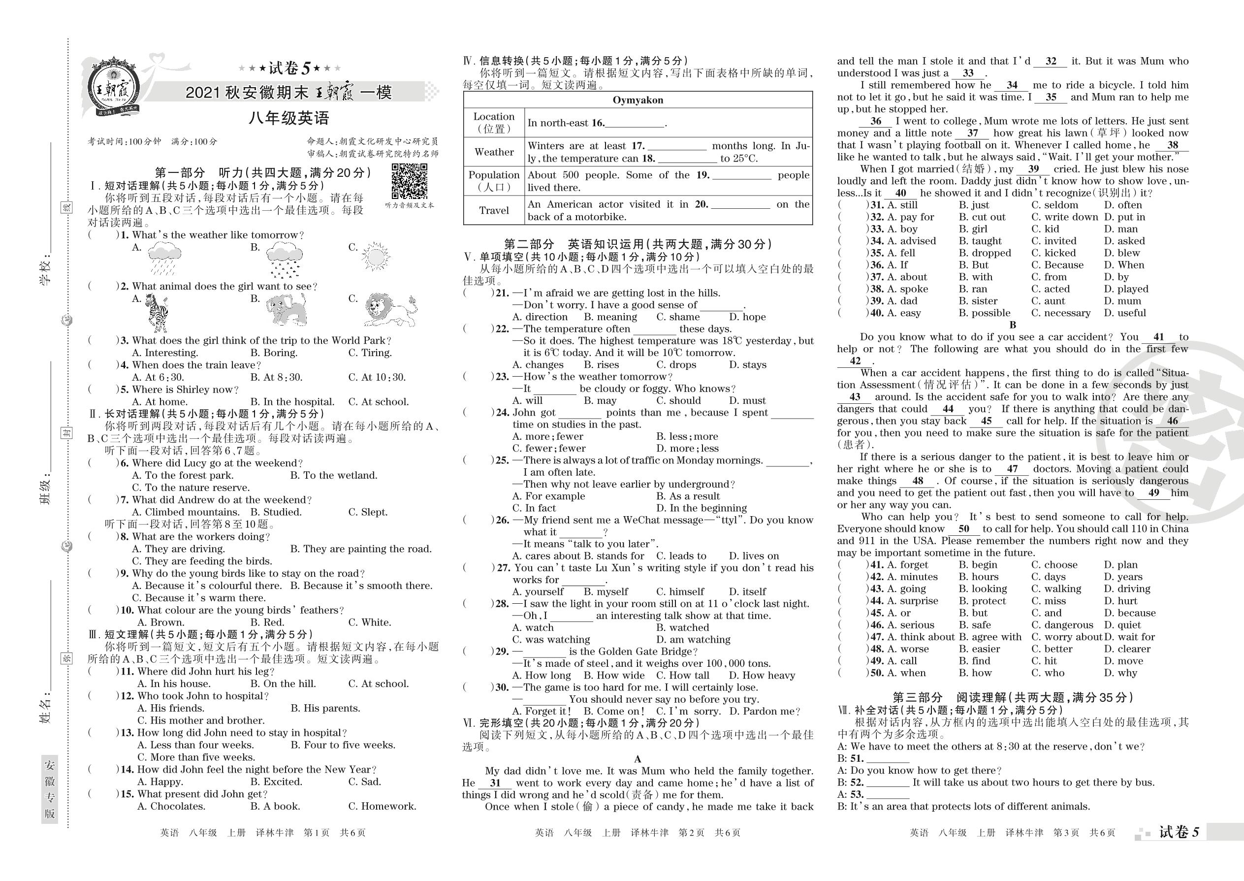 王朝霞期末模拟卷八年级上册英语(译林牛津版)【5】