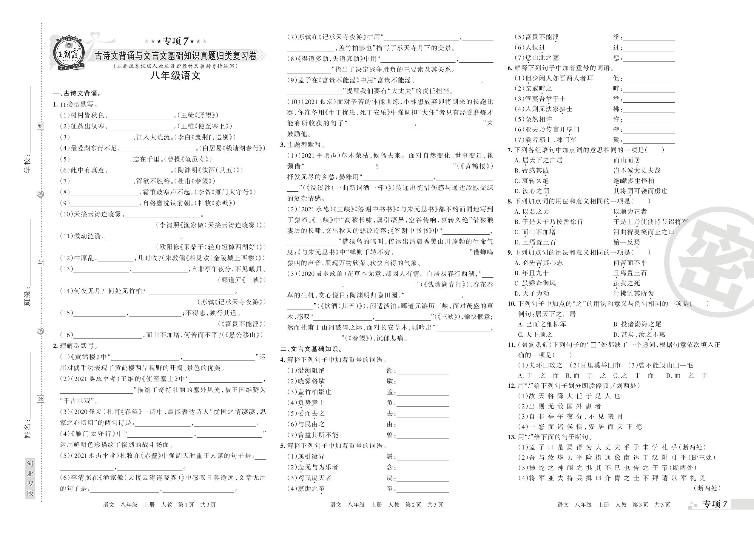 王朝霞期末专项卷——古诗文背诵与文言文基础知识真题归类复习卷八年级上册语文(人教版)【7】