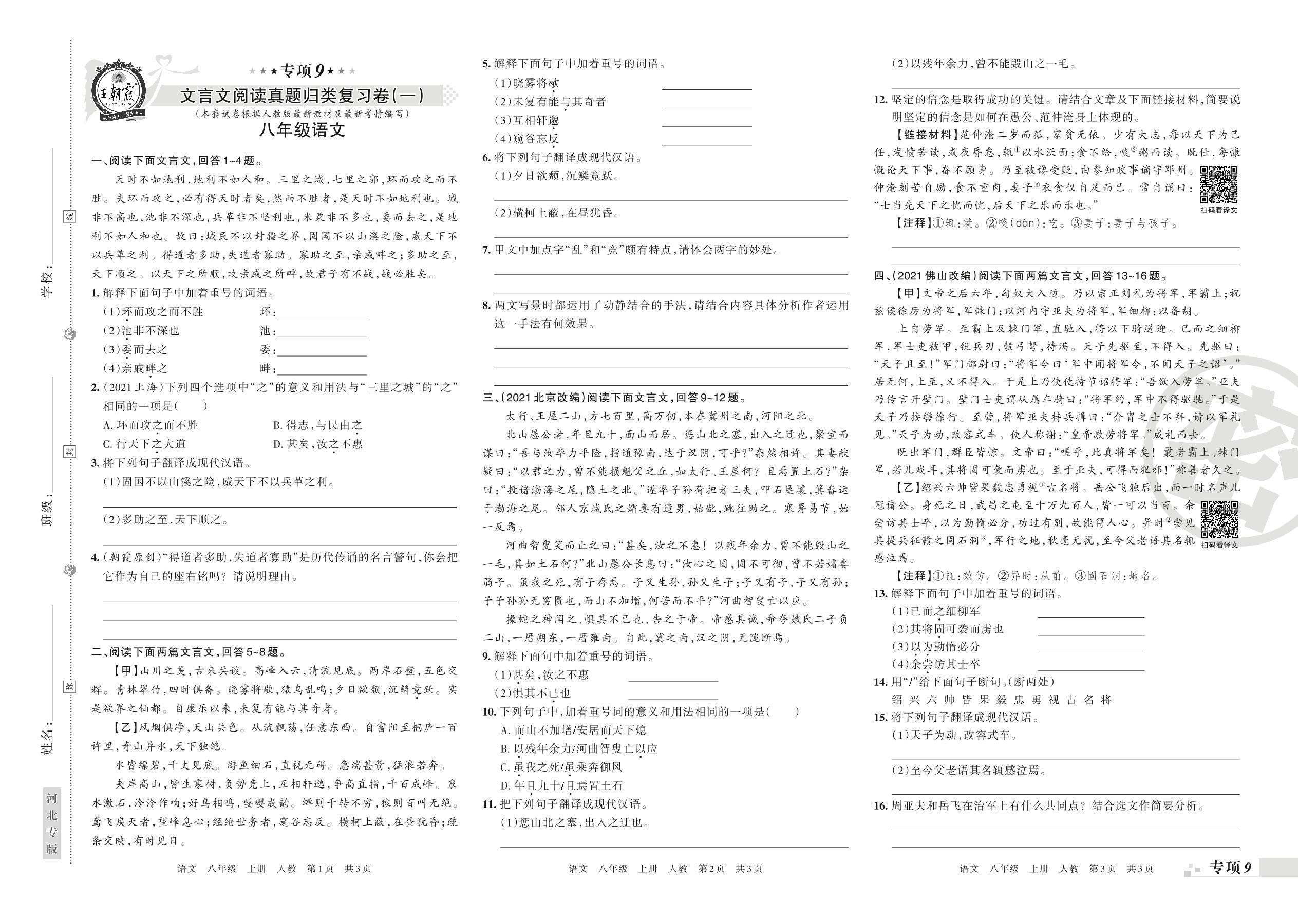 王朝霞期末专项卷——文言文阅读真题归类复习卷(一)八年级上册语文(人教版)【9】