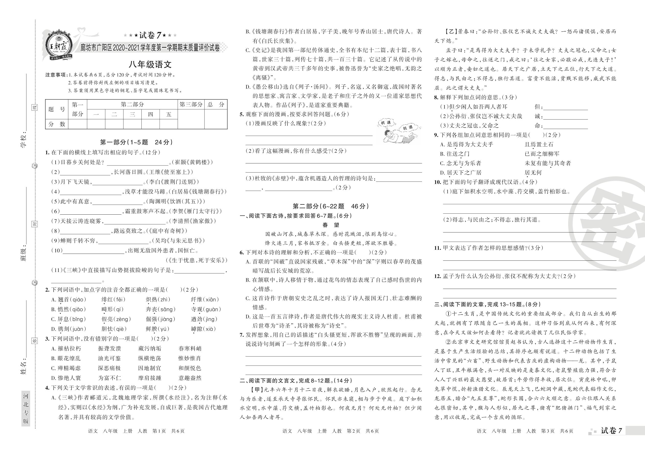 廊坊市广阳区2020~2021学年度第一学期期末质量评价试卷八年级语文(人教版)【7】