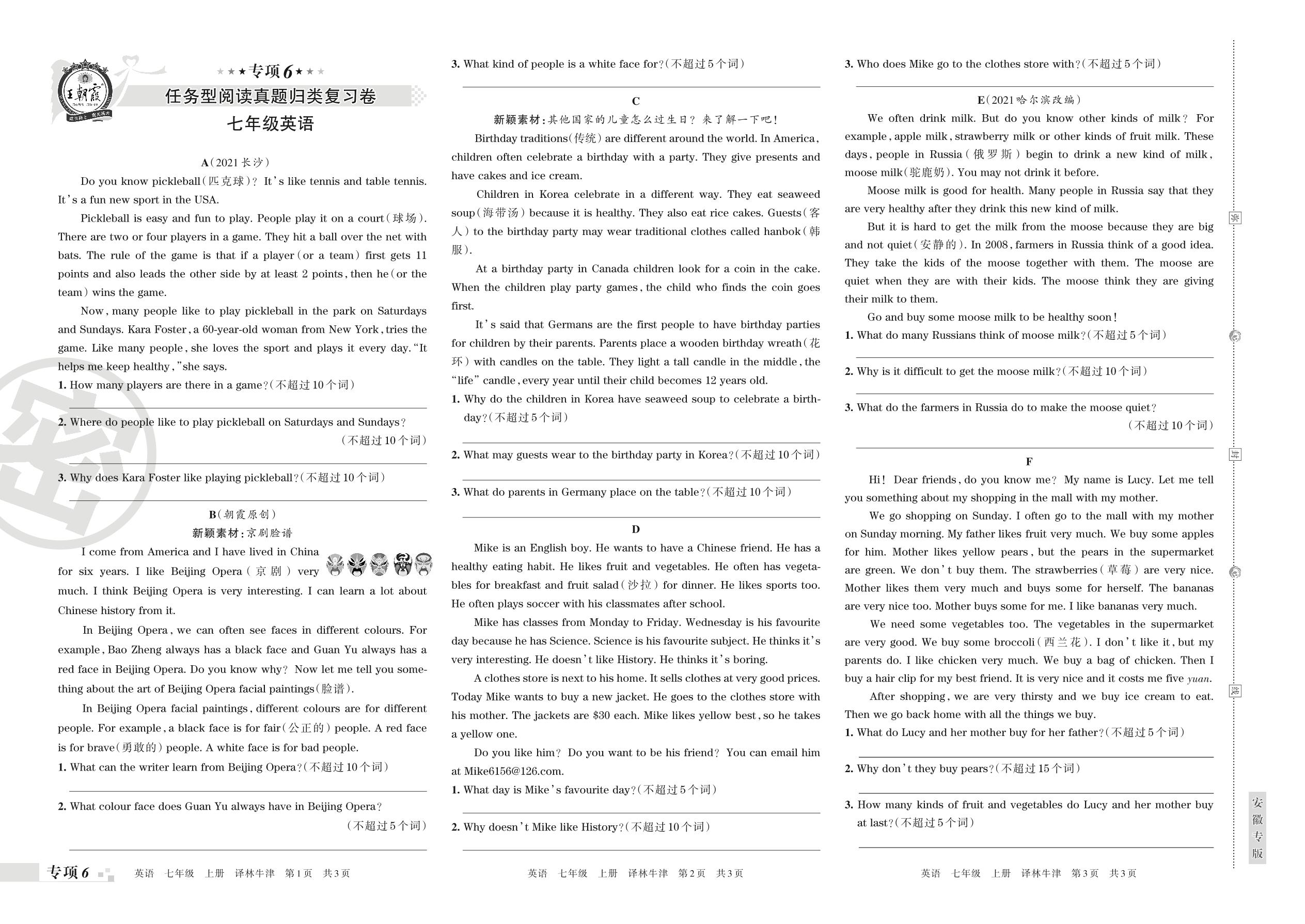 王朝霞期末专项卷——任务型阅读真题归类复习卷七年级上册英语(译林牛津版)【6】