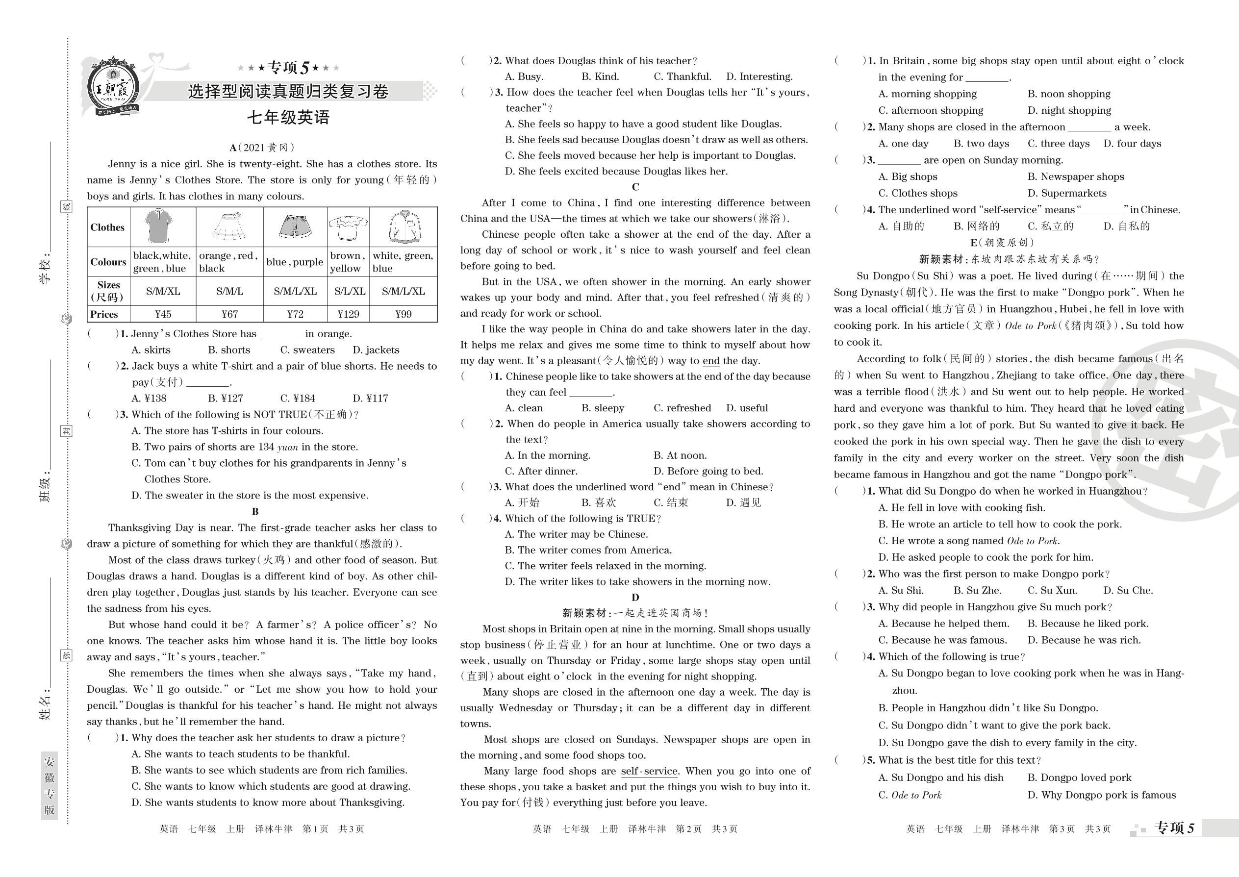 王朝霞期末专项卷——选择型阅读真题归类复习卷七年级上册英语(译林牛津版)【5】