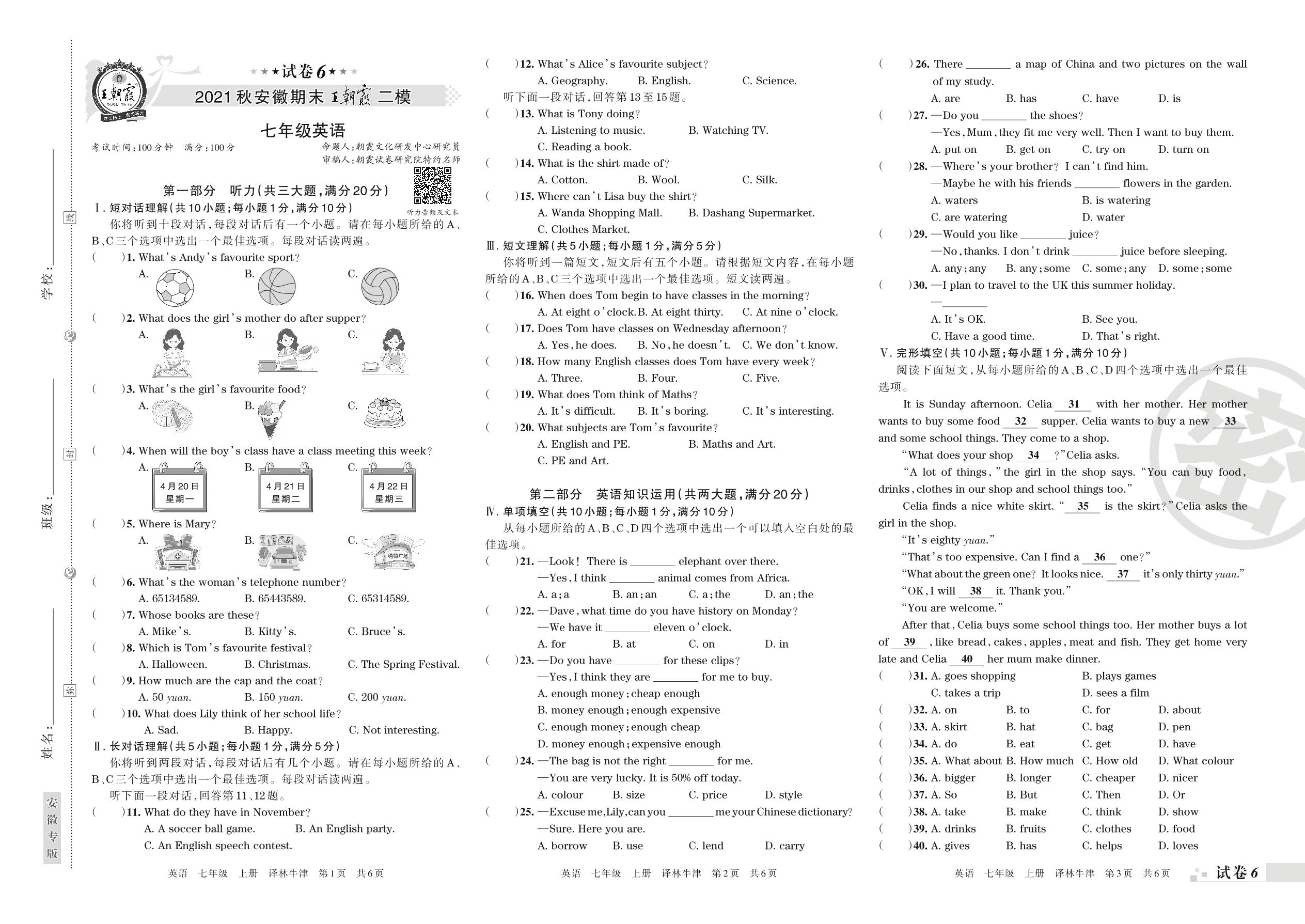 王朝霞期末模拟卷七年级上册英语(译林牛津版)【6】