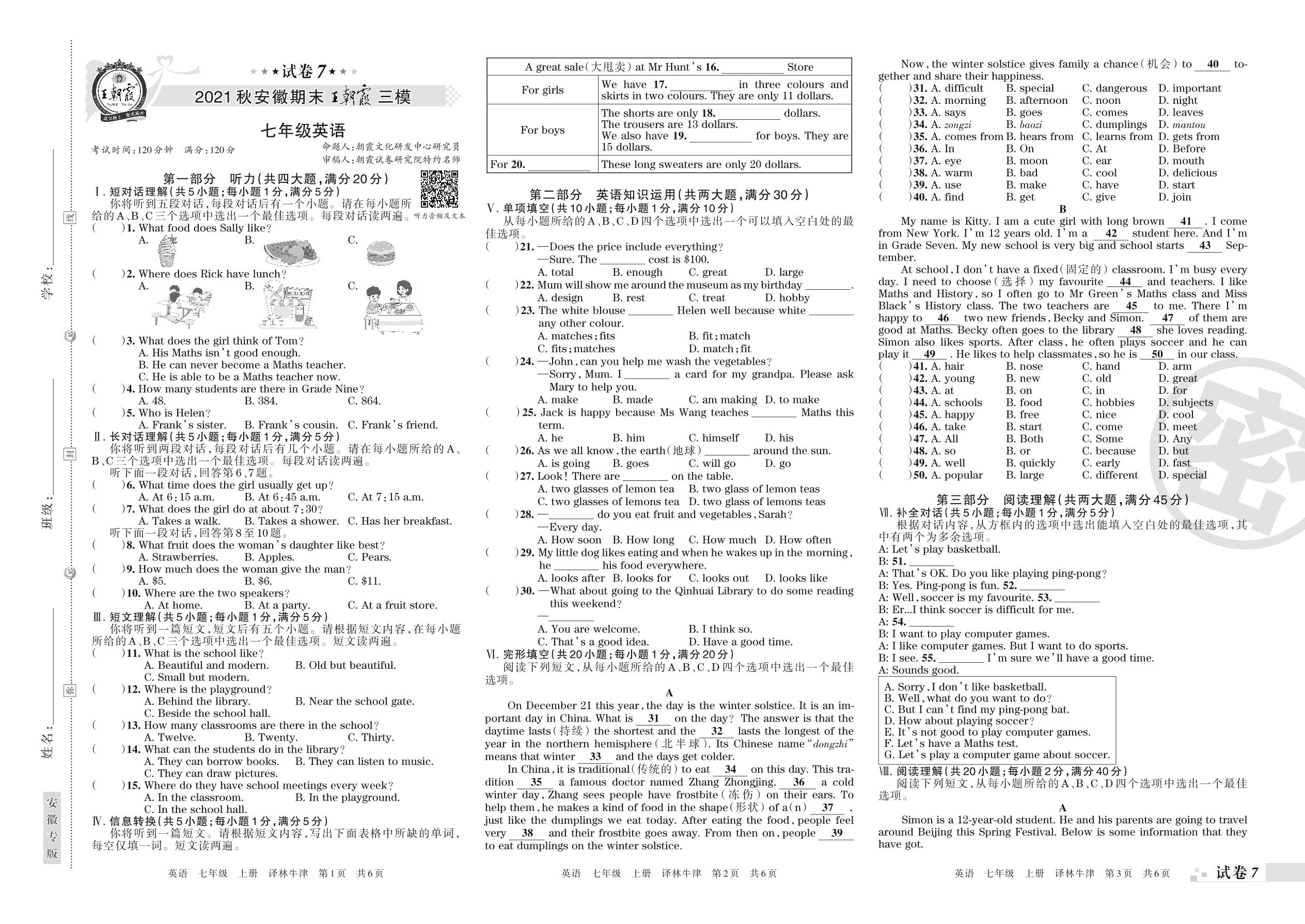王朝霞期末模拟卷七年级上册英语(译林牛津版)【7】