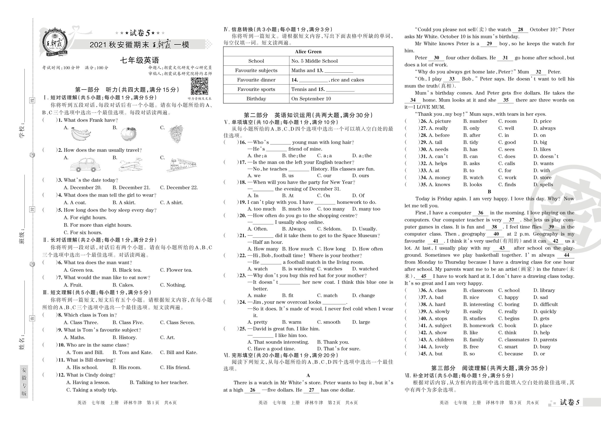 王朝霞期末模拟卷七年级上册英语(译林牛津版)【5】