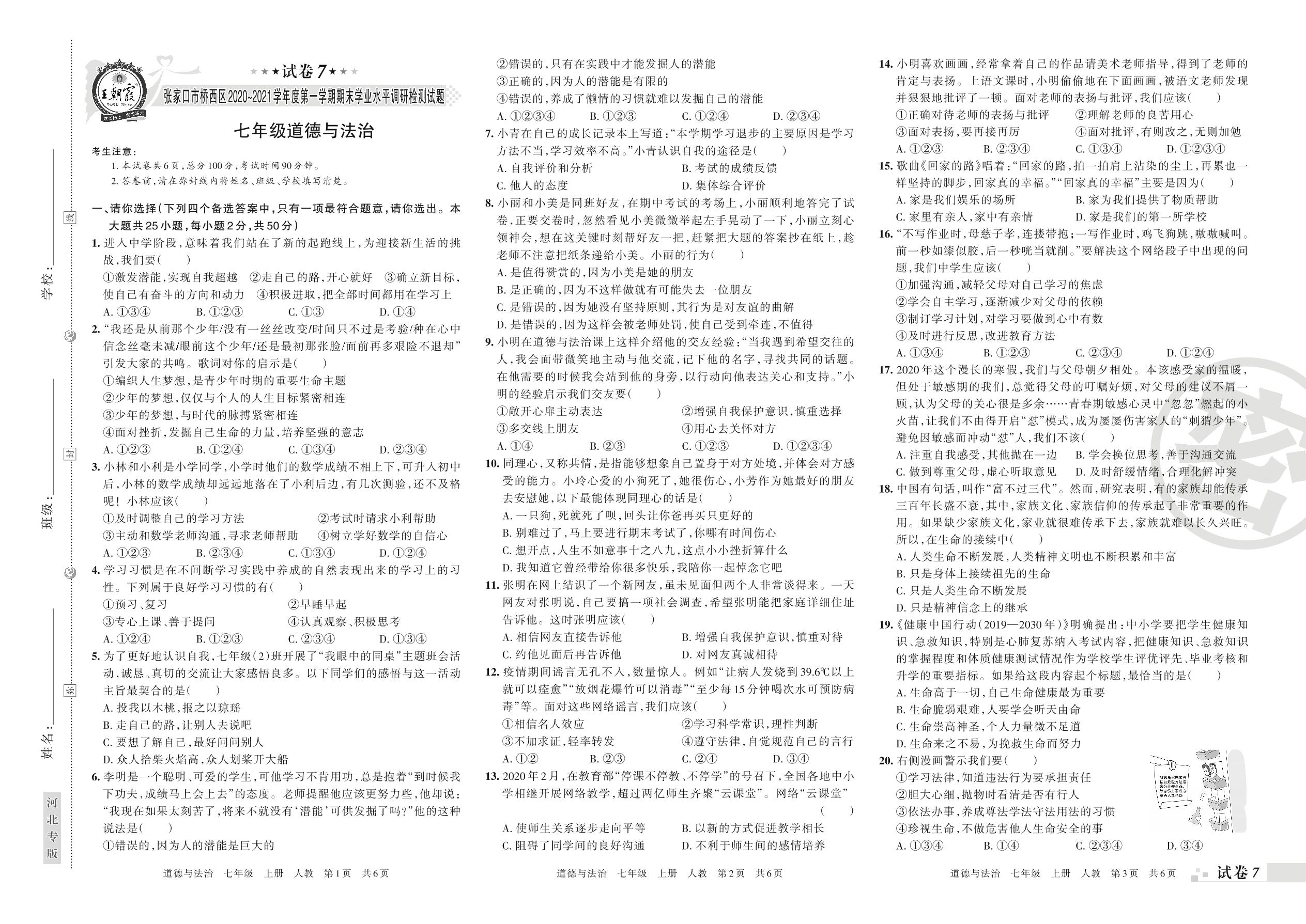 张家口市桥西区2020~2021学年度第一学期期末学业水平调研检测试题七年级道德与法治(人教版)【7】