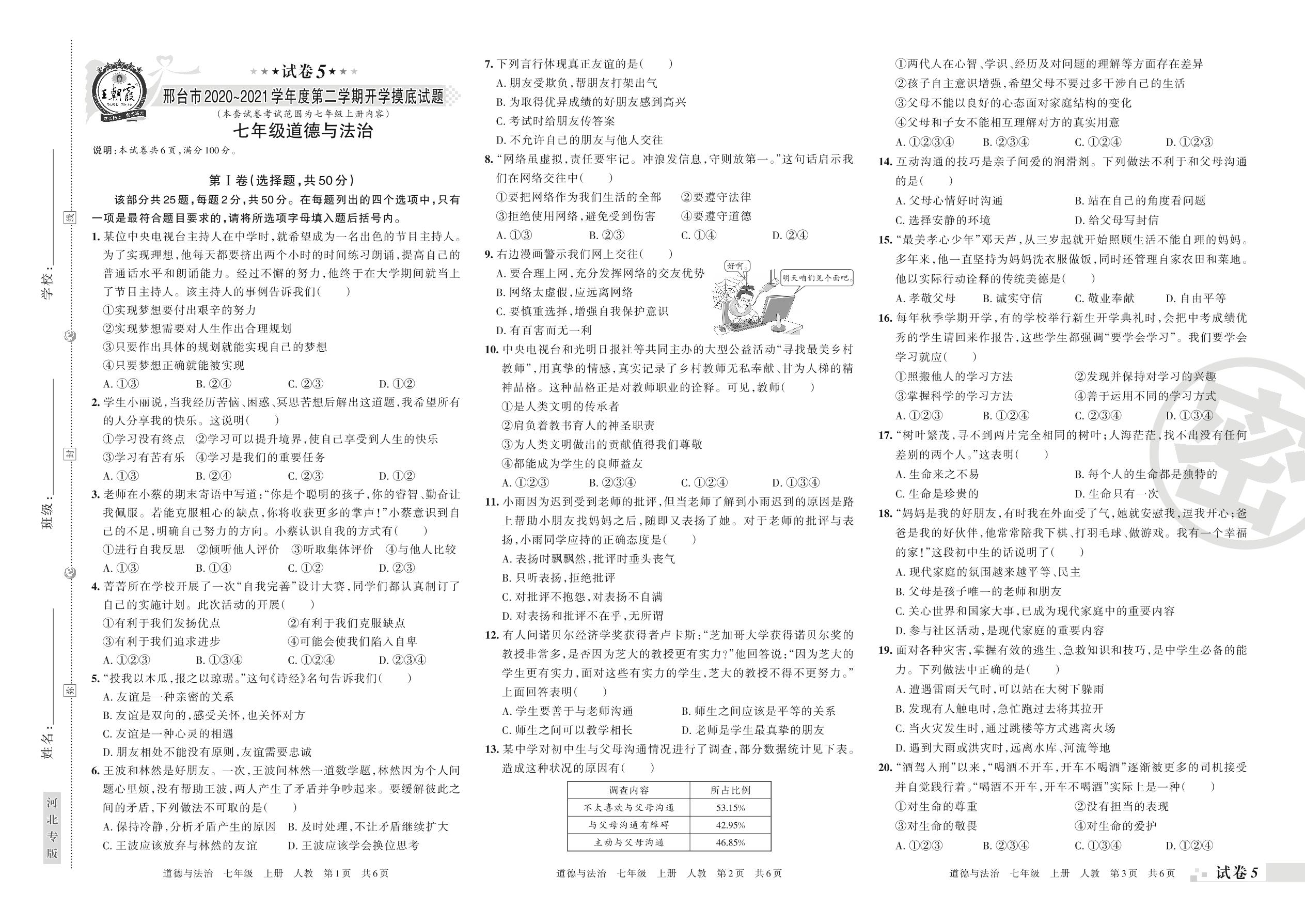 邢台市2020~2021学年度第二学期开学摸底试题七年级道德与法治(人教版)【5】