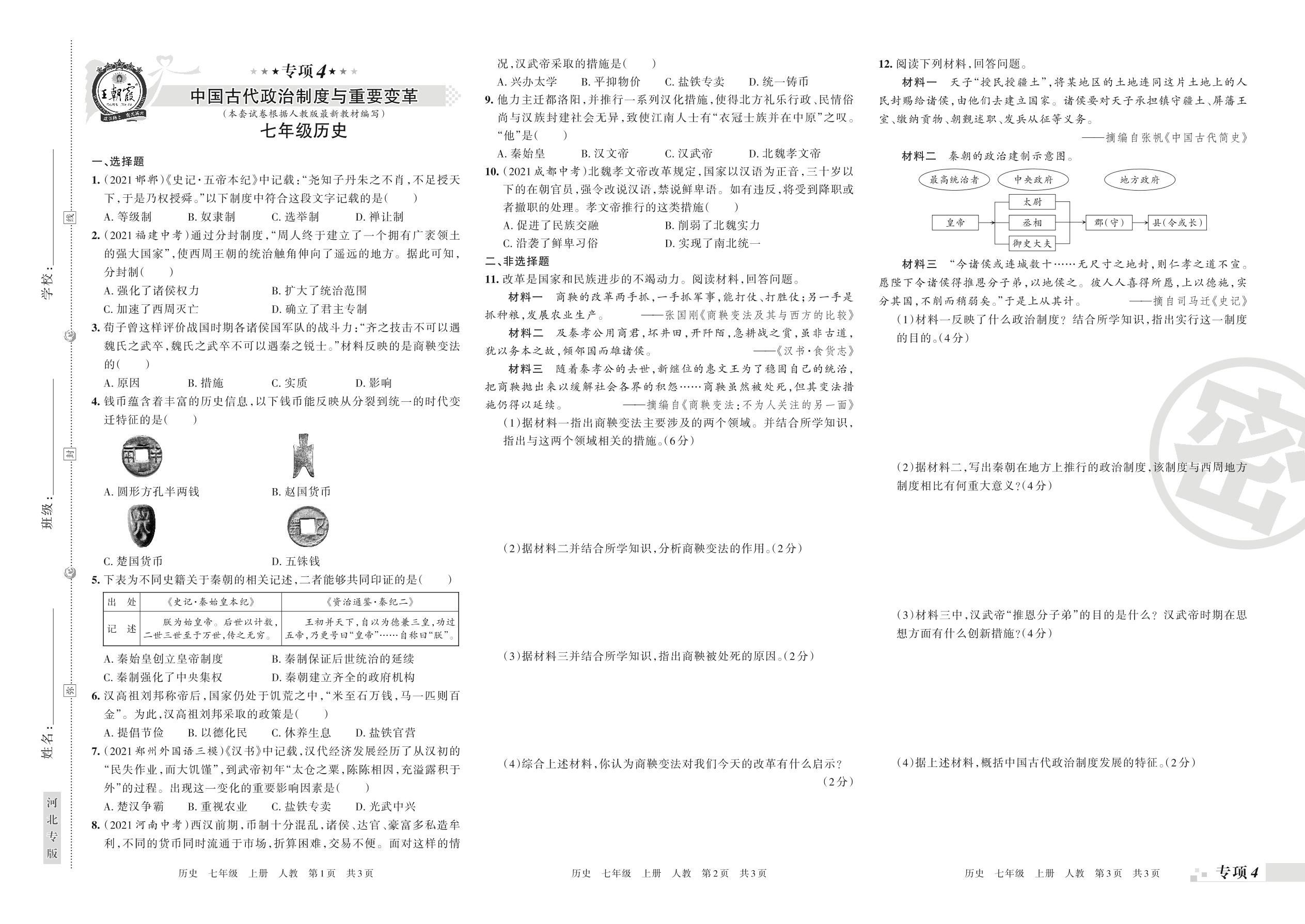 王朝霞期末专项卷——中国古代政治制度与重要变革七年级上册历史(人教版)_R211223153038943【4】
