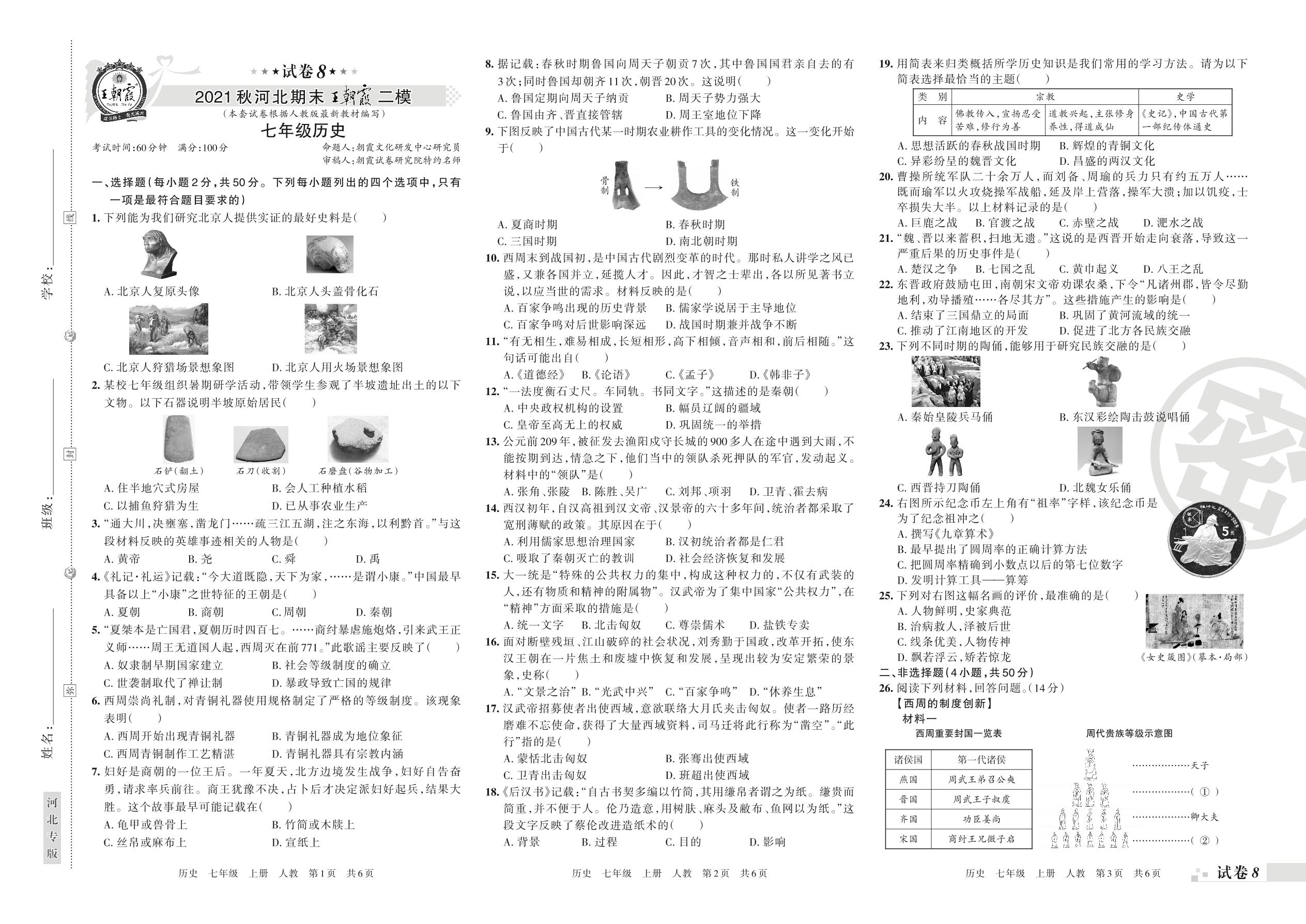 王朝霞期末模拟卷七年级上册历史(人教版)【8】