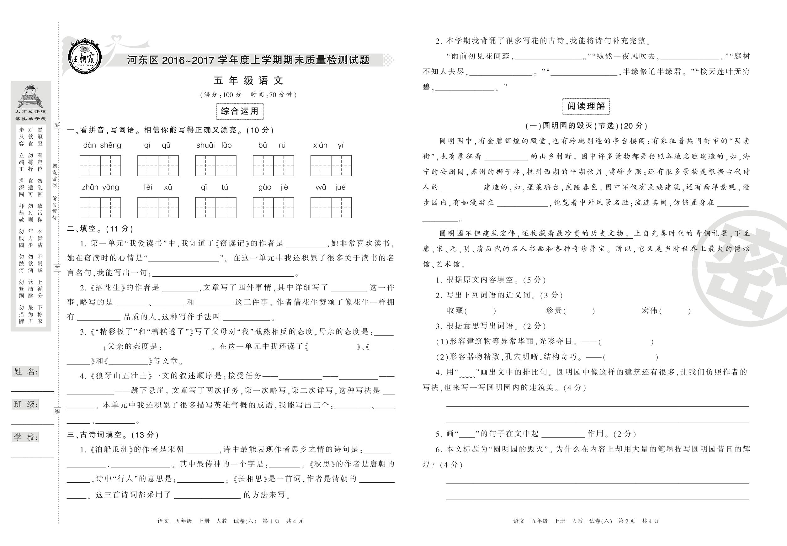 2016-2017学年第一学期临沂市河东区五年级语文试卷(人教版)【6】