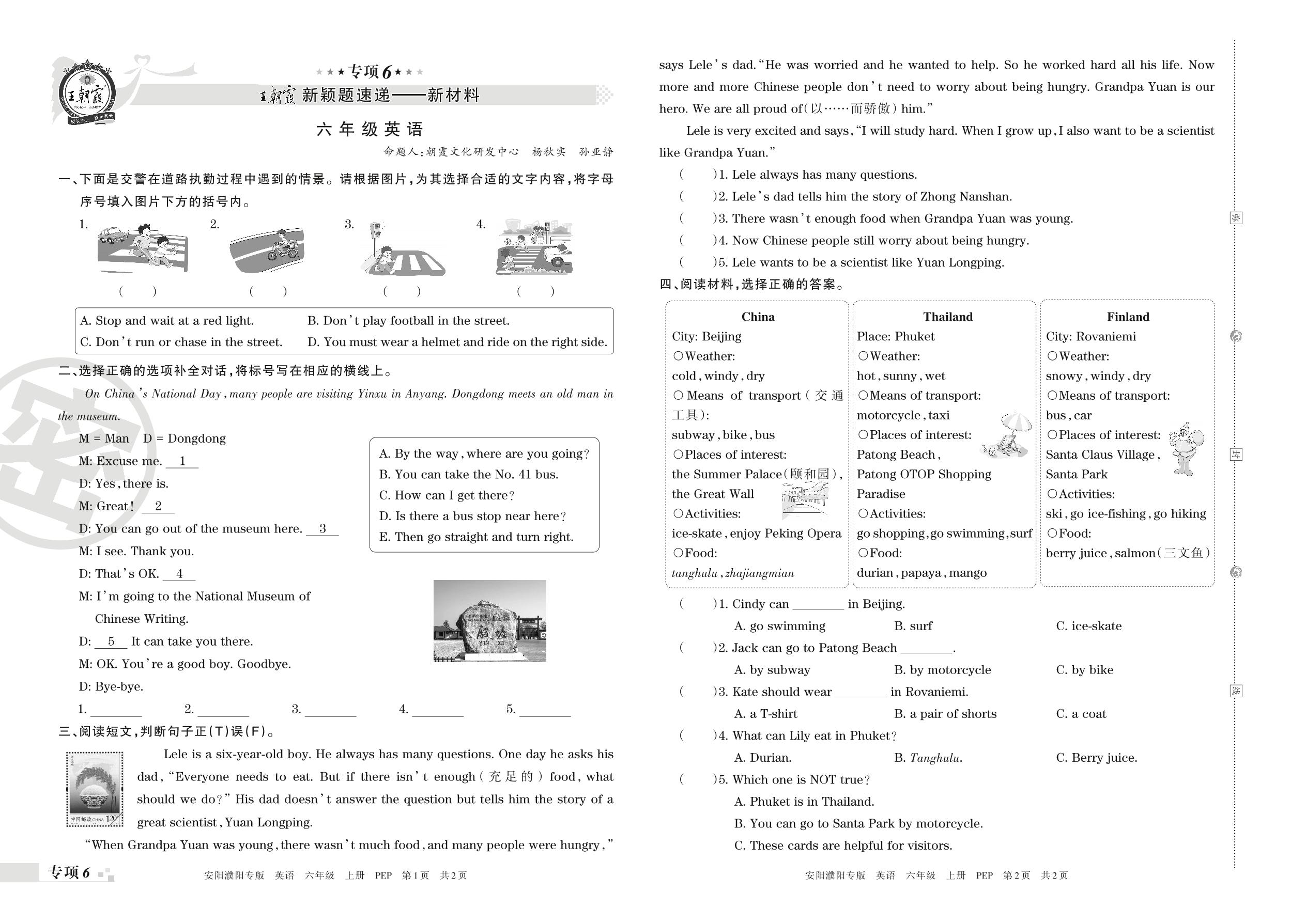 王朝霞期末专项卷——新颖题速递:新材料六年级上册英语(人教PEP版)【6】