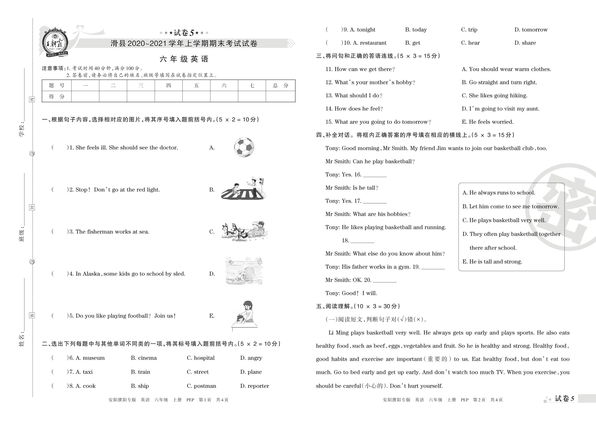 滑县2020~2021学年上学期期末考试试卷六年级英语(人教PEP版)【5】