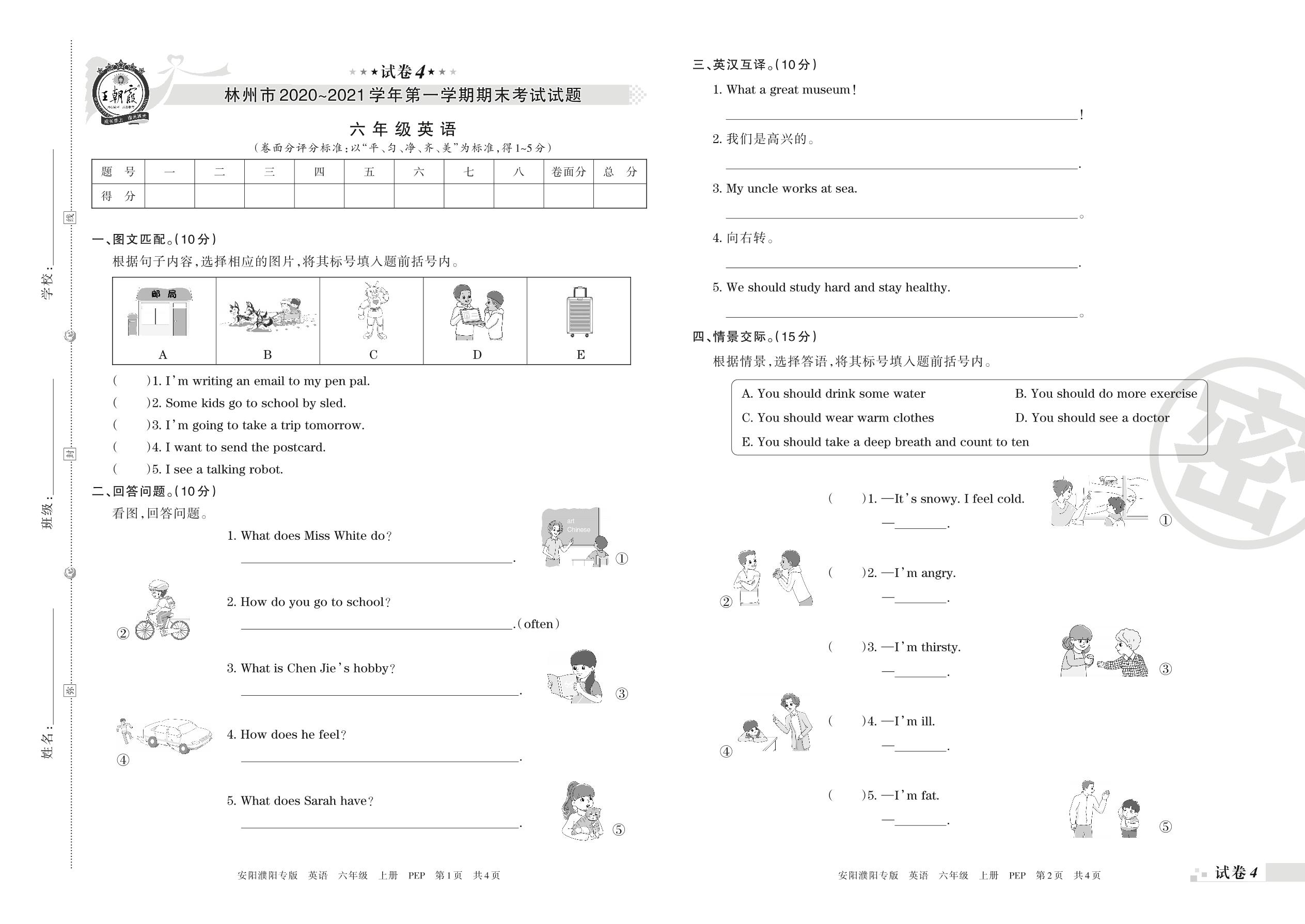 林州市2020~2021学年第一学期期末考试试题六年级英语(人教PEP版)【4】