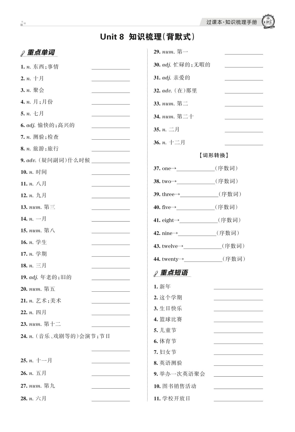 王朝霞期末过课本——Unit 8 知识梳理(背默式)七年级上册英语(人教版)【9】