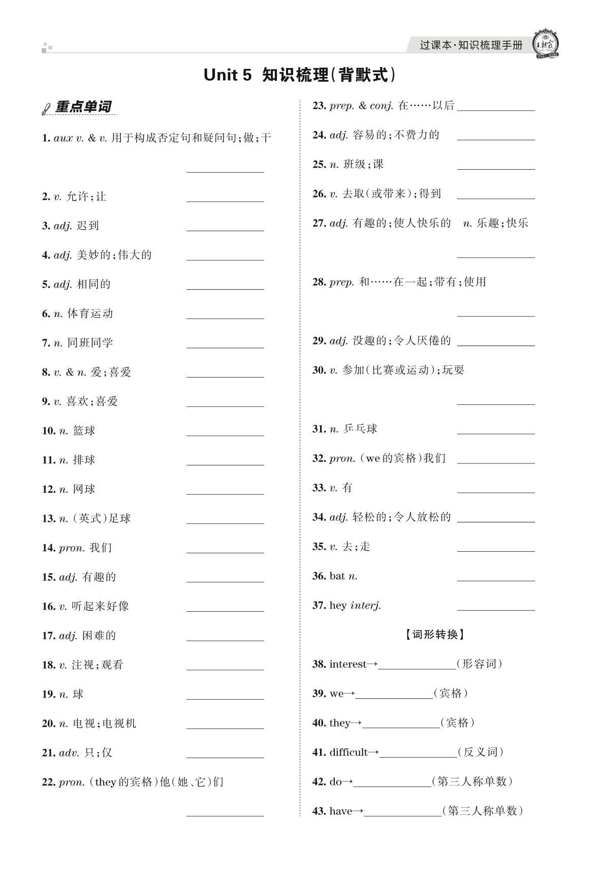 王朝霞期末过课本——Unit 5 知识梳理(背默式)七年级上册英语(人教版)【6】