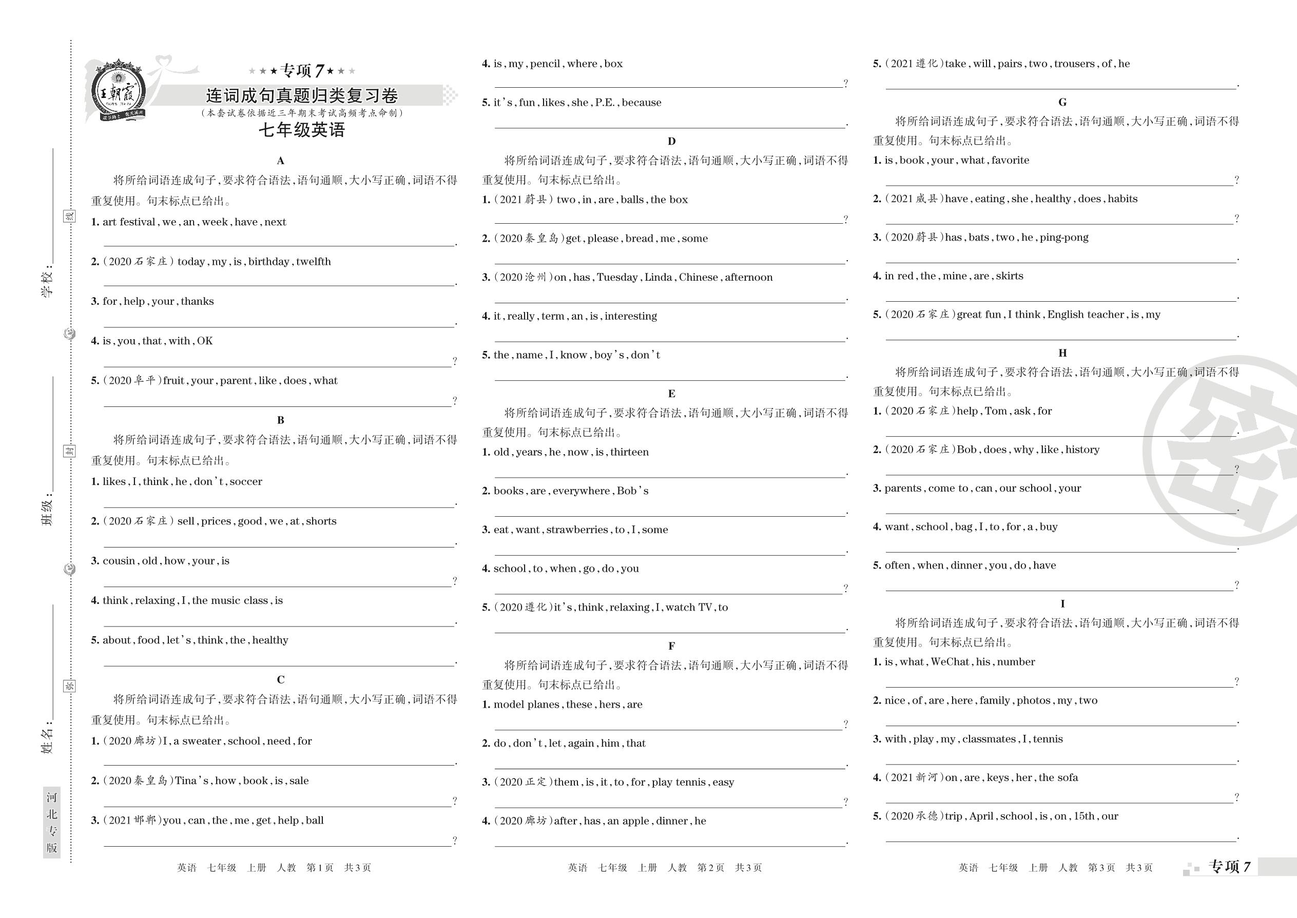 王朝霞期末专项卷——连词成句真题归类复习卷七年级上册英语(人教版)【7】