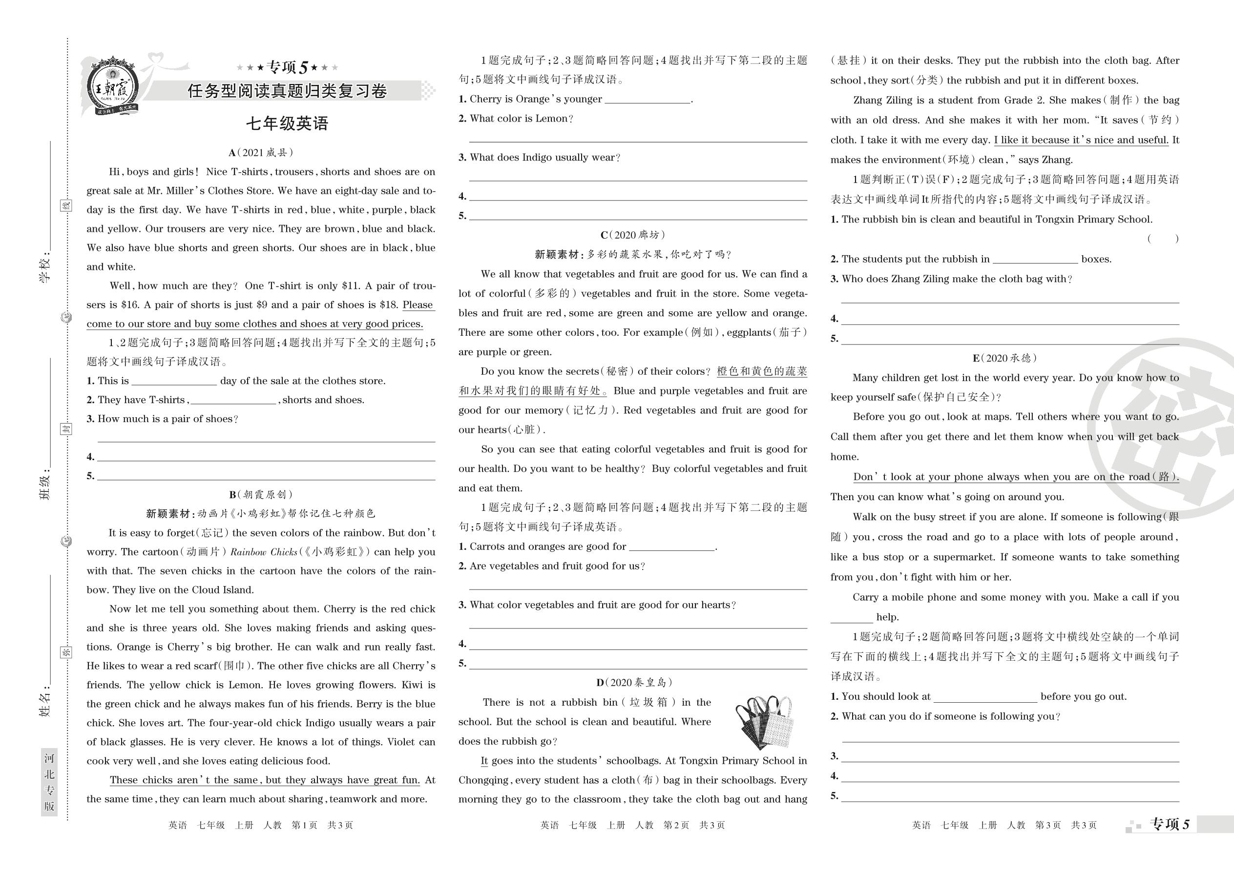 王朝霞期末专项卷——任务型阅读真题归类复习卷七年级上册英语(人教版)【5】
