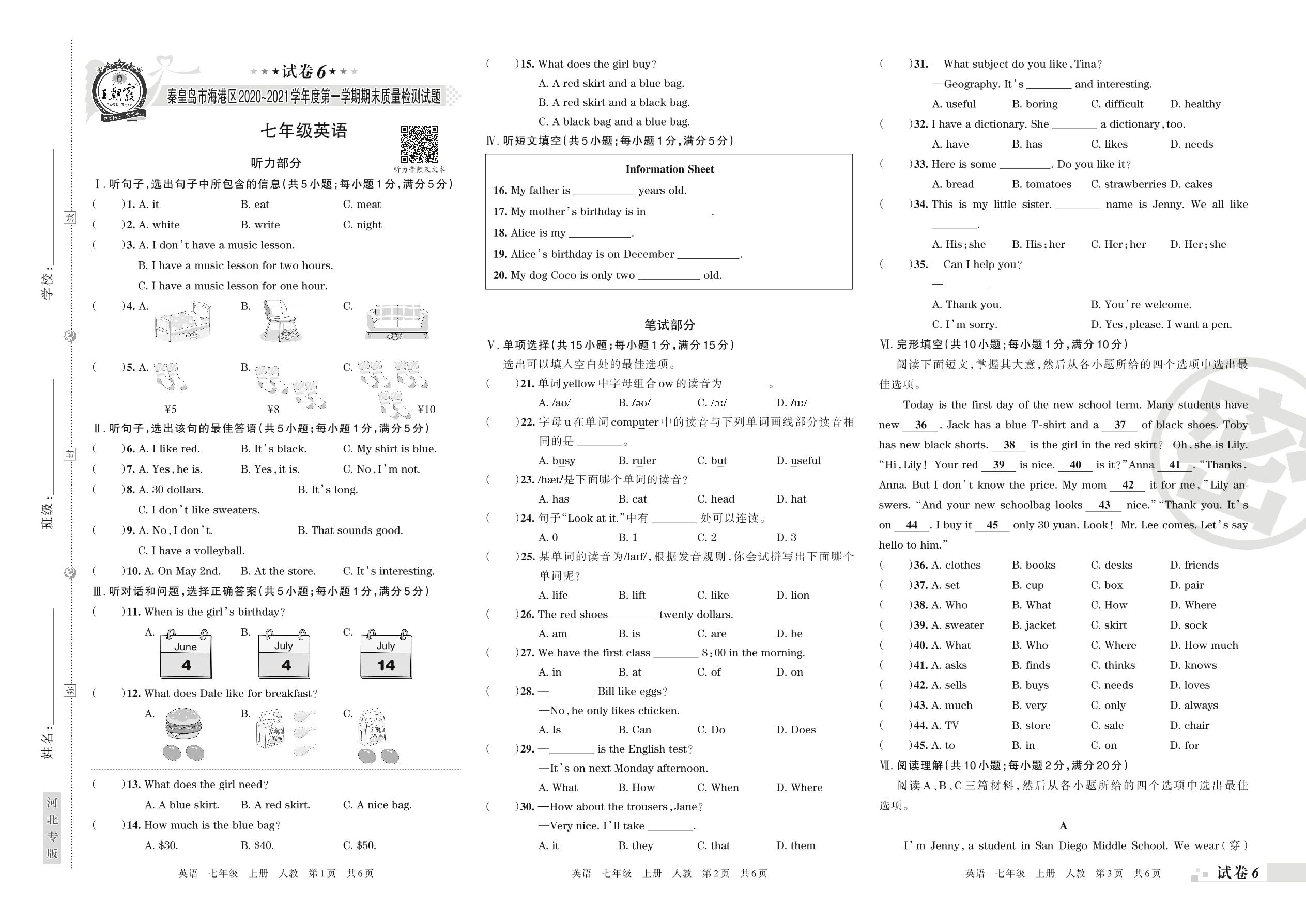 秦皇岛市海港区2020~2021学年度第一学期期末质量检测试题七年级英语(人教版)【6】