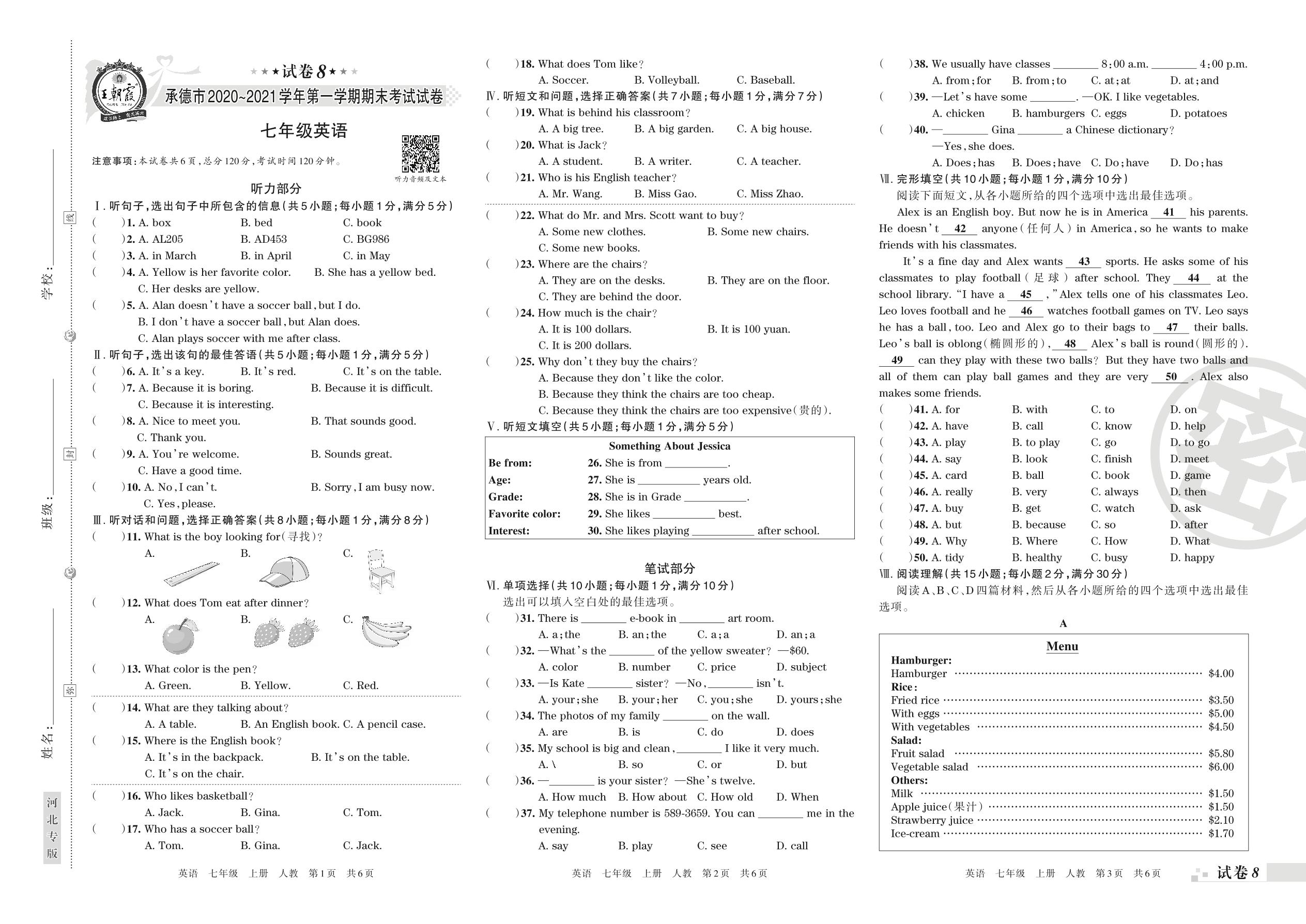 承德市2020~2021学年第一学期期末考试七年级英语(人教版)【8】