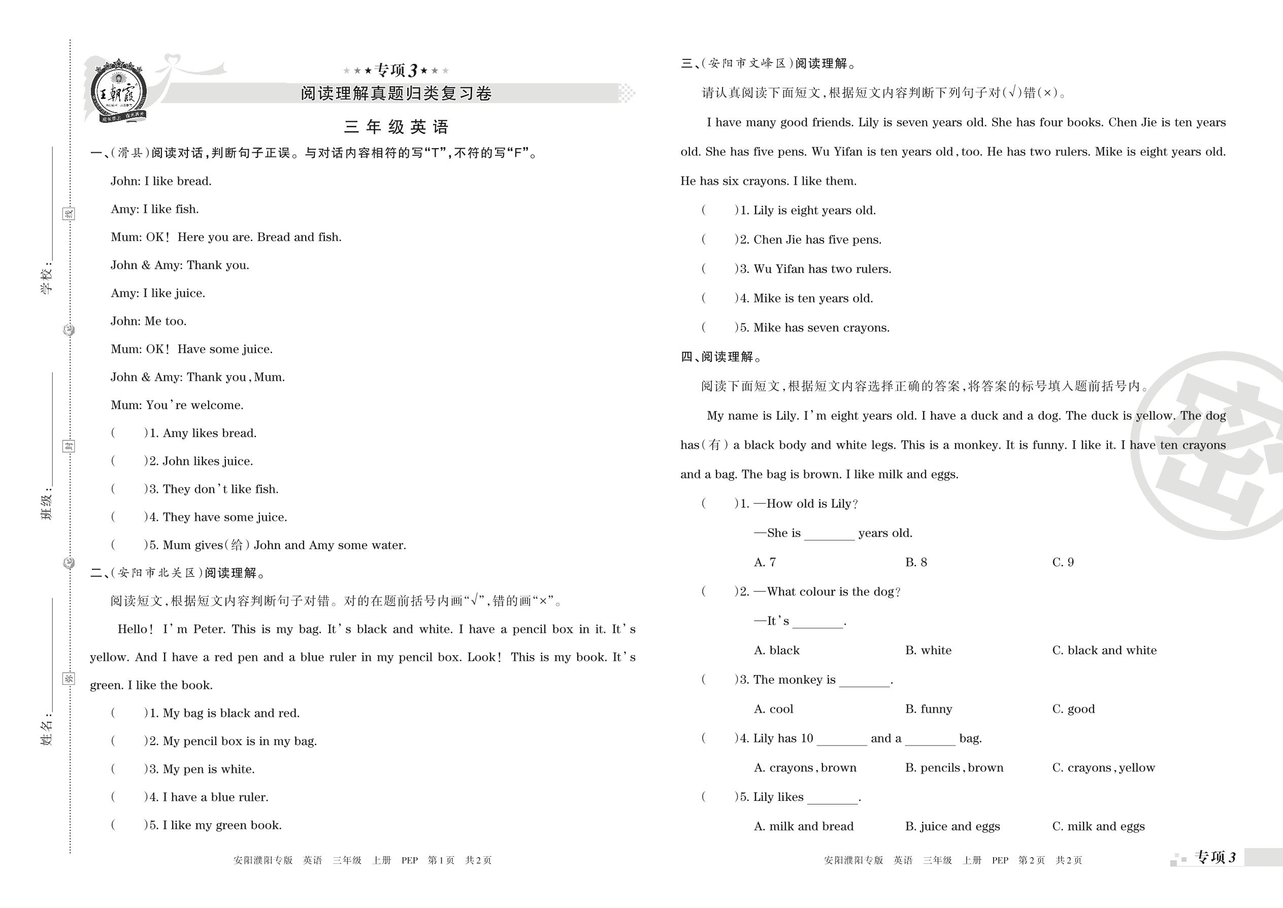 王朝霞期末专项卷——阅读理解真题归类复习卷三年级上册英语(人教PEP版)_R211223154526469【3】