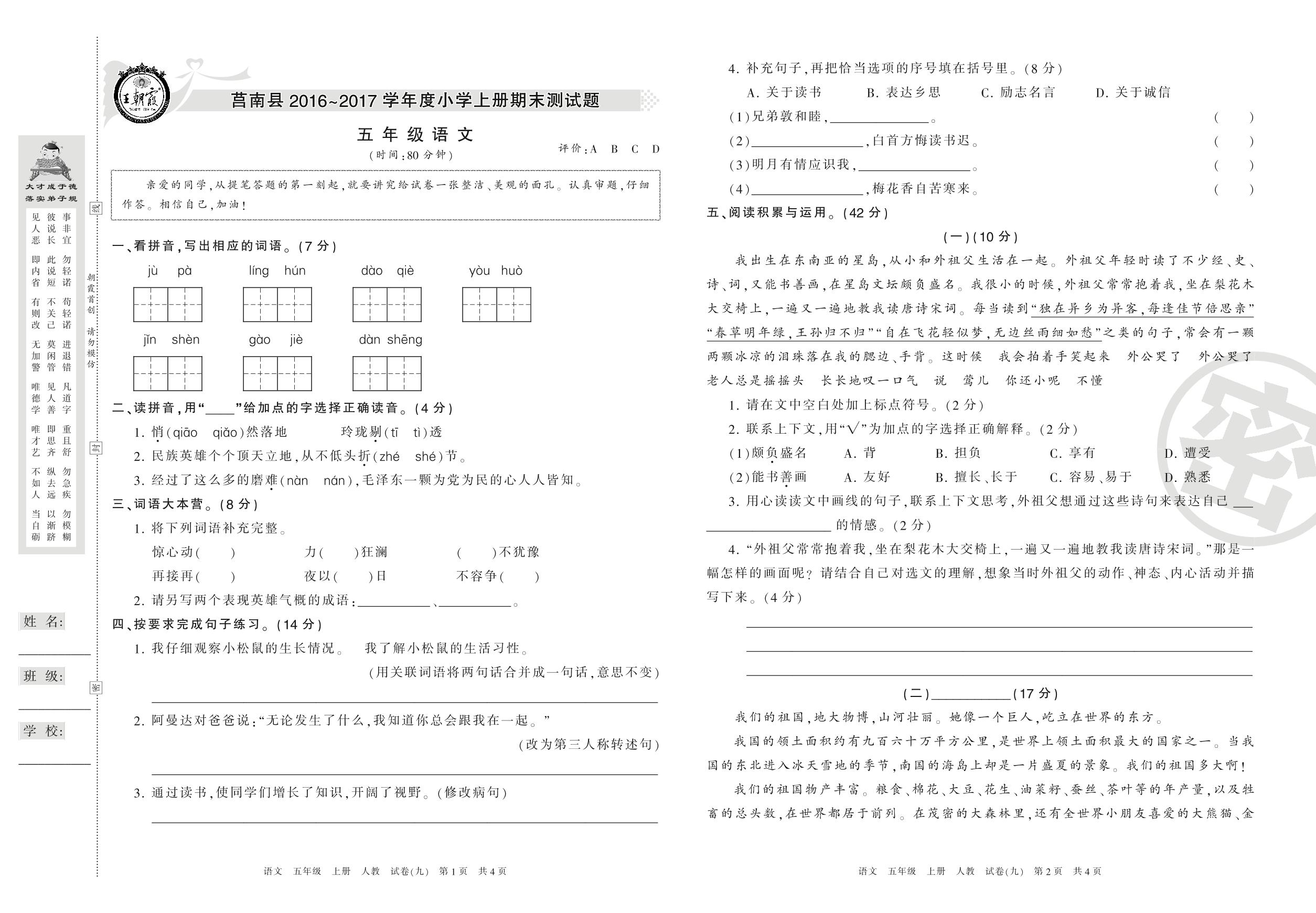 2016-2017学年第一学期临沂市莒南县五年级语文试卷(人教版)【9】