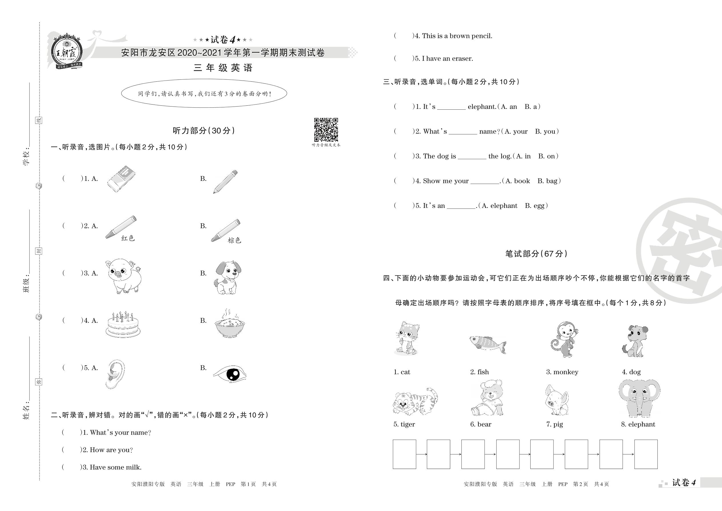 安阳市龙安区2020~2021学年第一学期期末测试卷三年级英语(人教PEP版)【4】