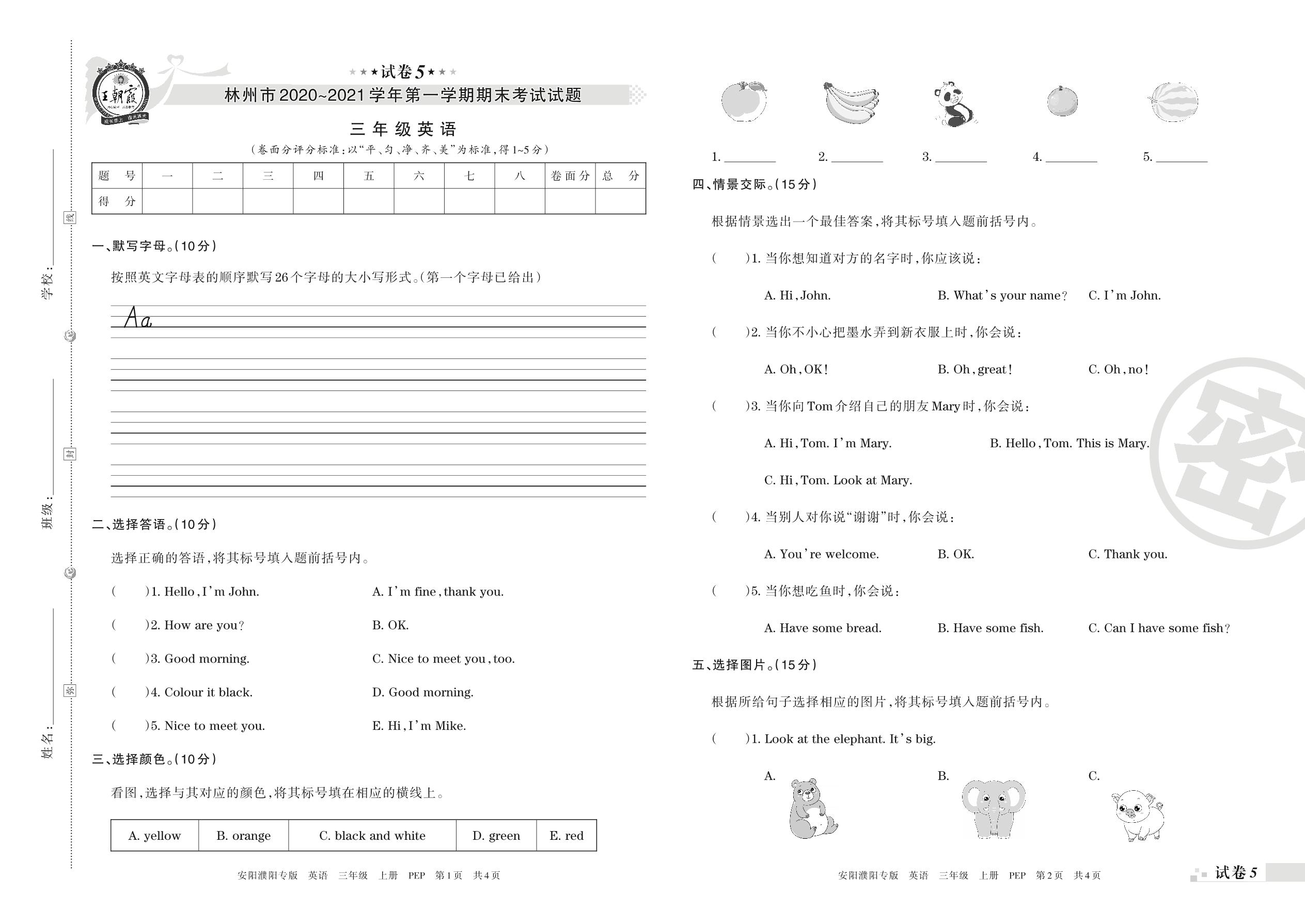 林州市2020~2021学年第一学期期末考试试题三年级英语(人教PEP版)【5】