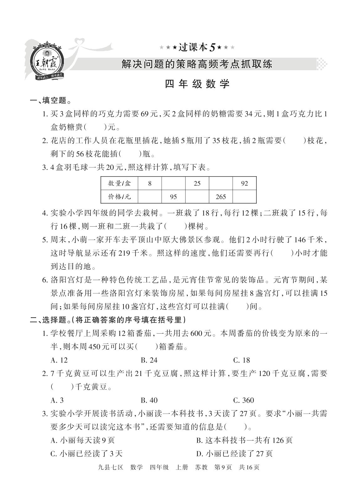 王朝霞期末过课本——解决问题的策略高频考点抓取练四年级上册数学(苏教版)【5】