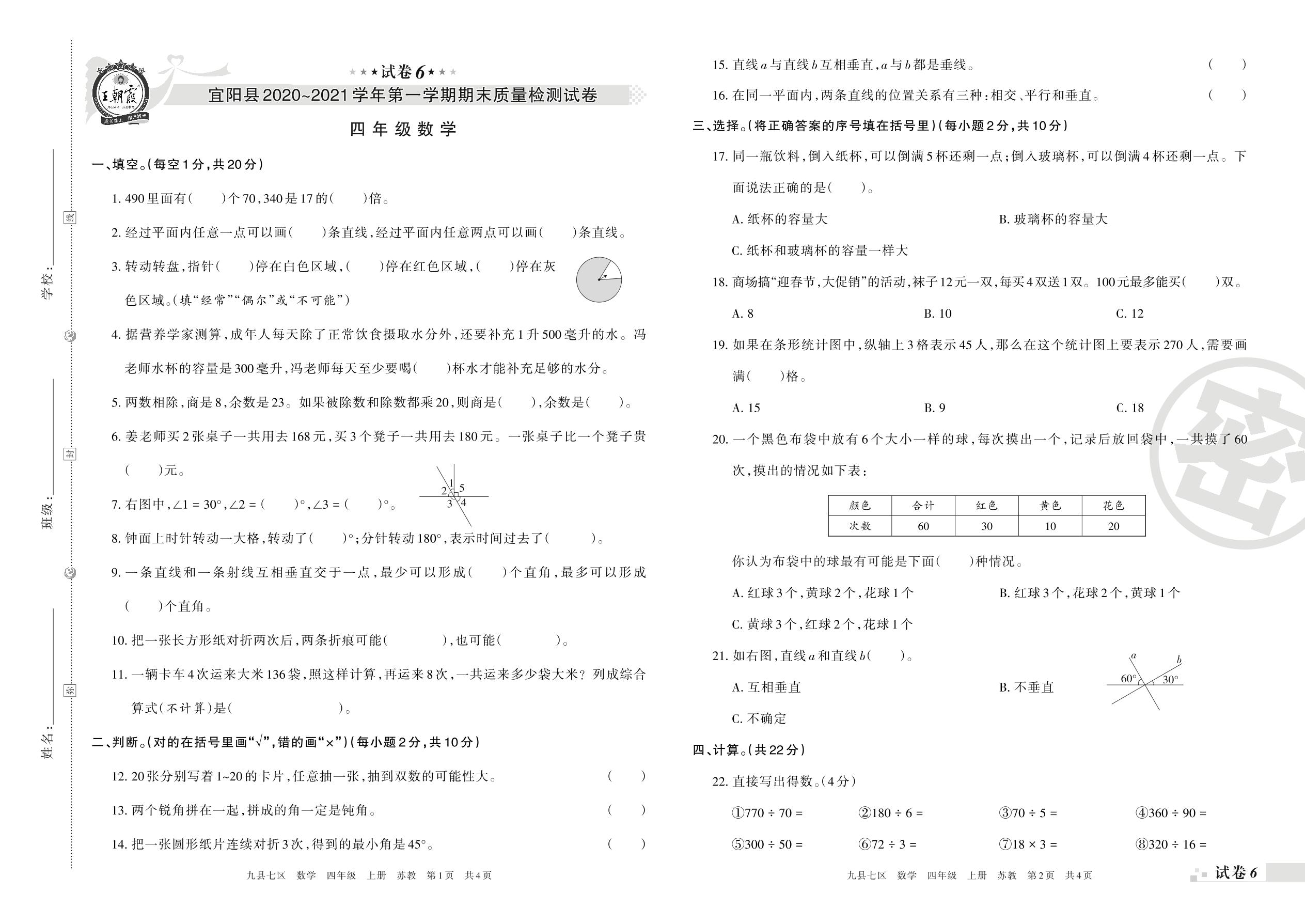 宜阳县2020~2021学年第一学期期末质量检测试卷四年级数学(苏教版)【6】