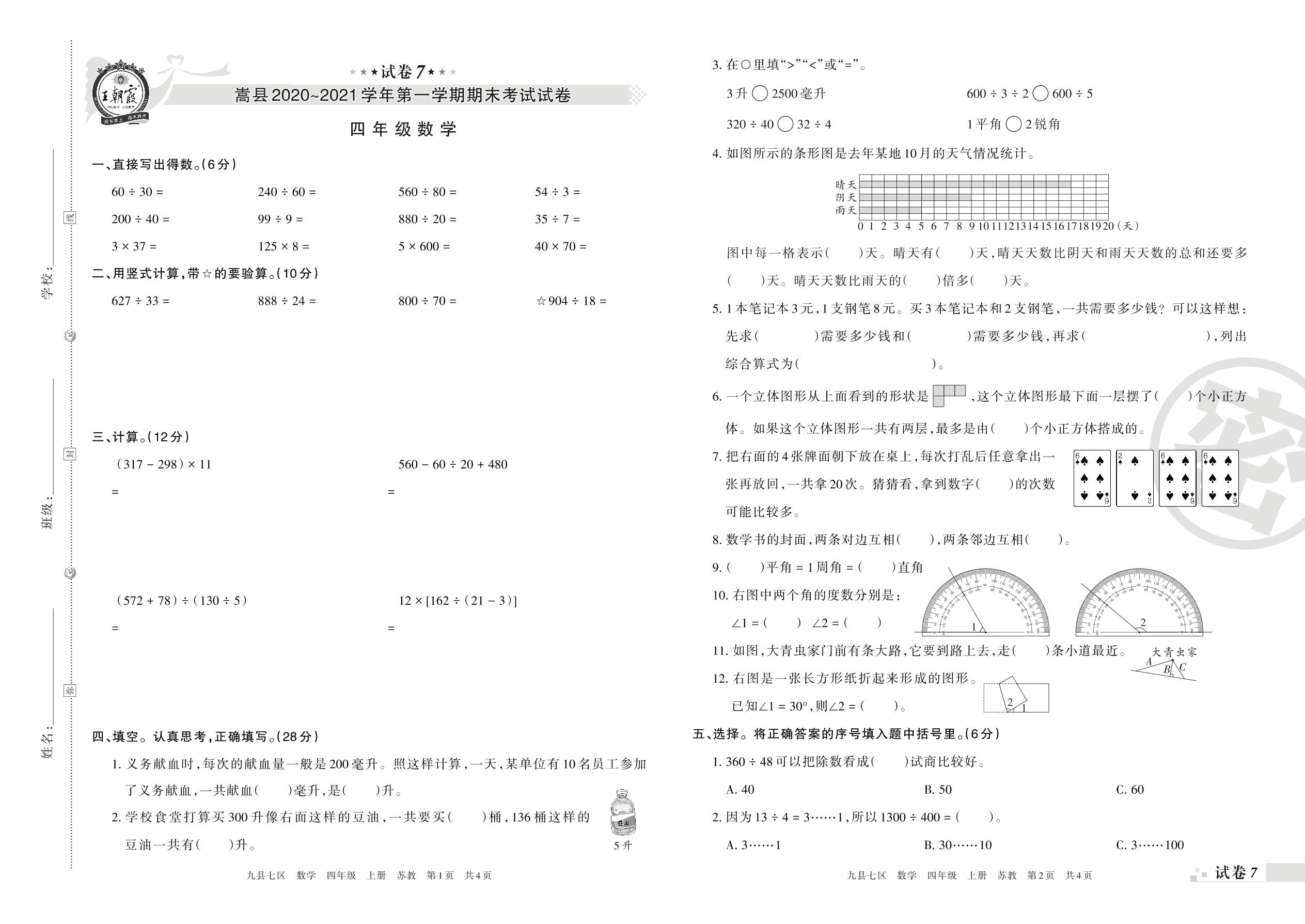 嵩县2020~2021学年第一学期期末考试试卷四年级数学(苏教版)【7】
