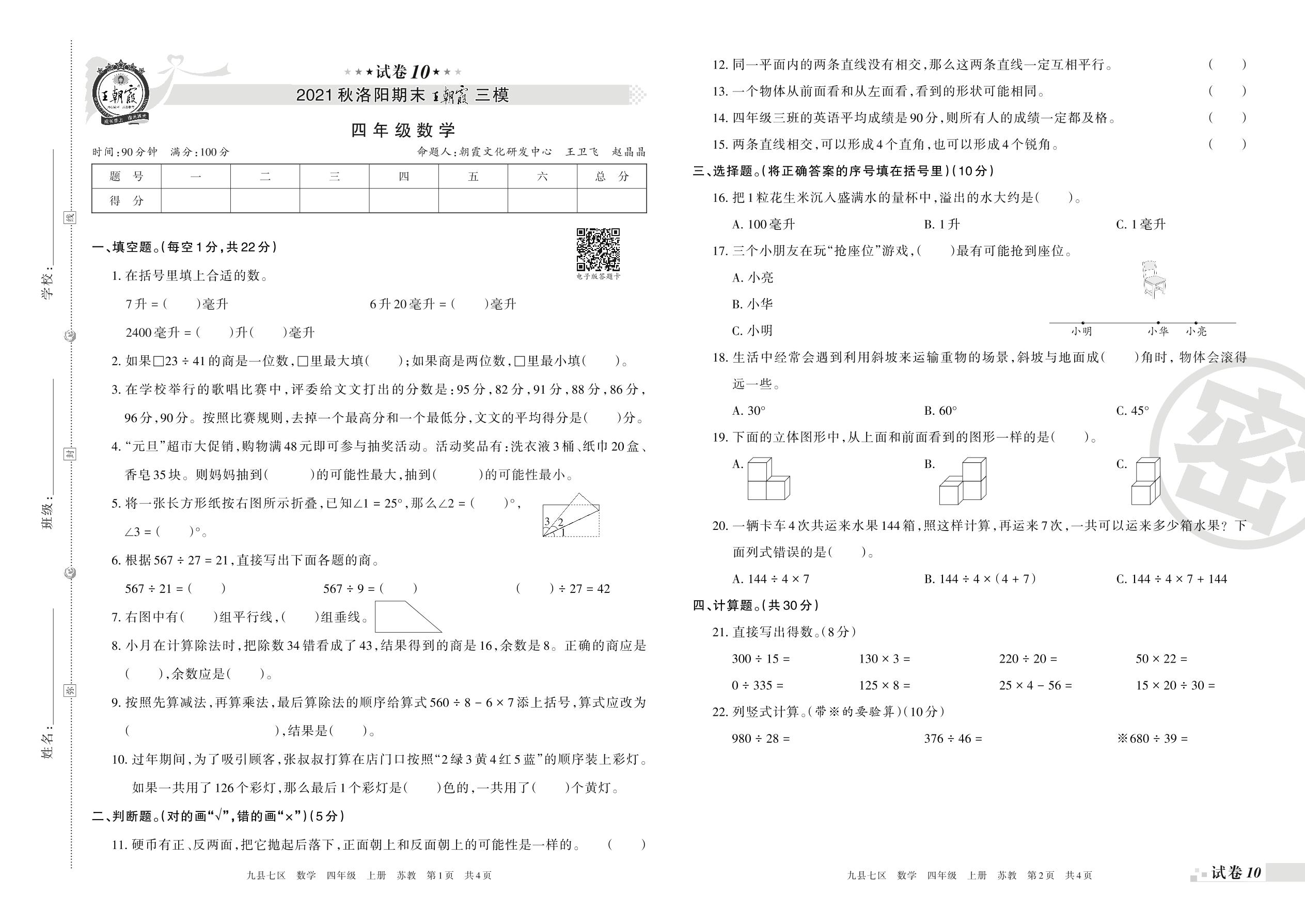 王朝霞期末模拟卷四年级上册数学(苏教版)【10】