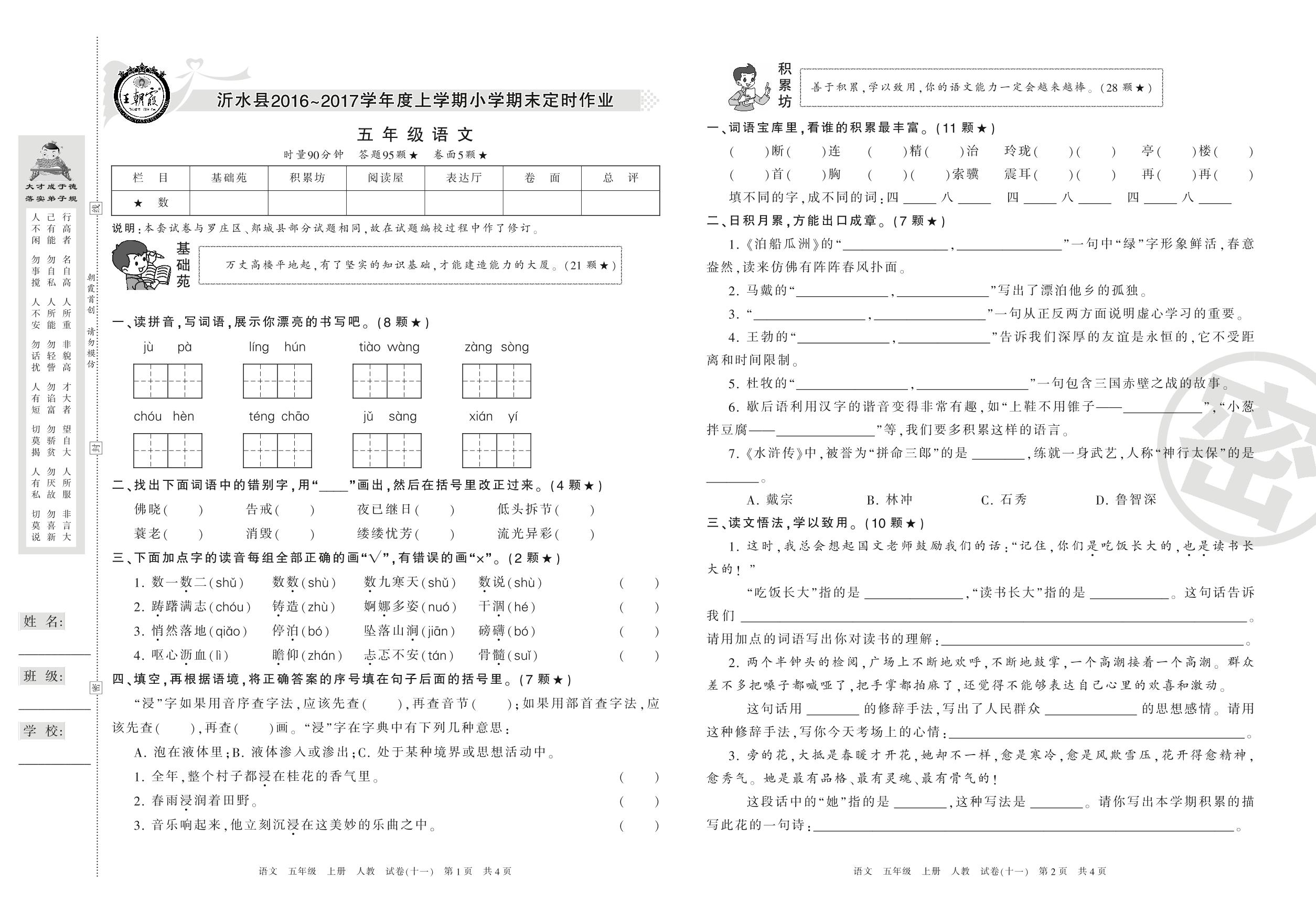 2016-2017学年第一学期临沂市沂水县五年级语文试卷(人教版)【11】