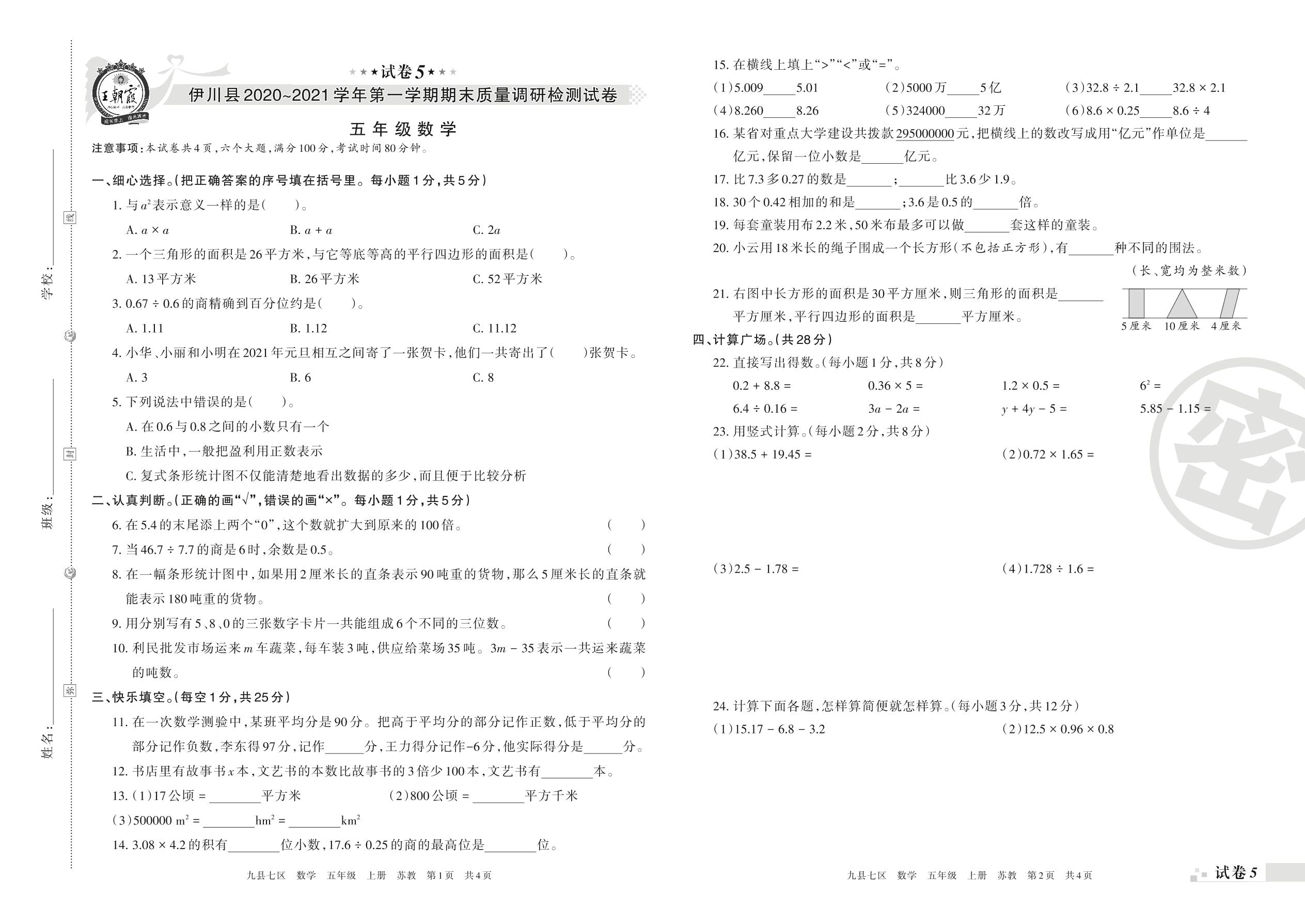 伊川县2020~2021学年第一学期期末质量调研检测试卷五年级数学(苏教版)【5】