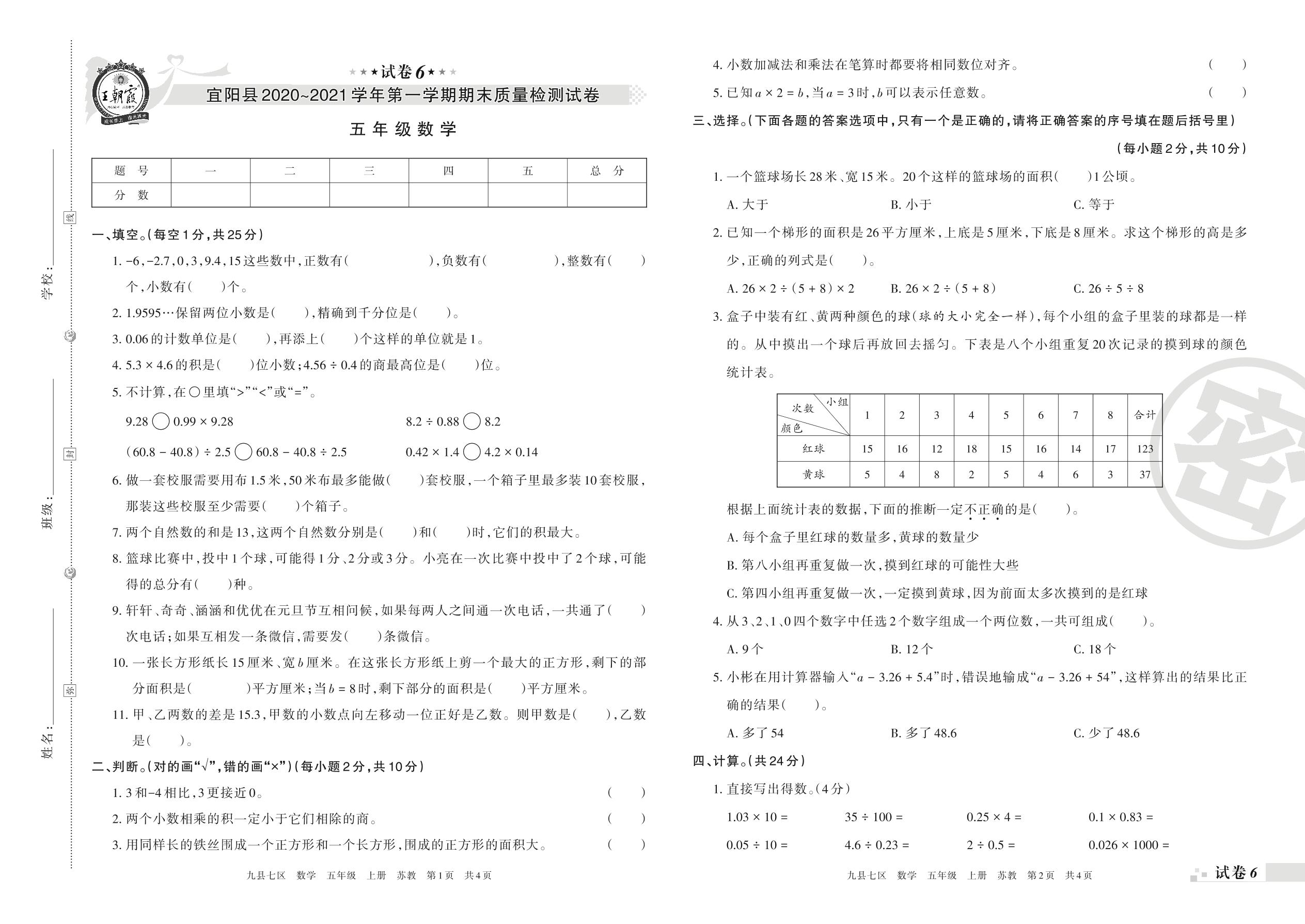 宜阳县2020~2021学年第一学期期末质量检测试卷五年级数学(苏教版)【6】