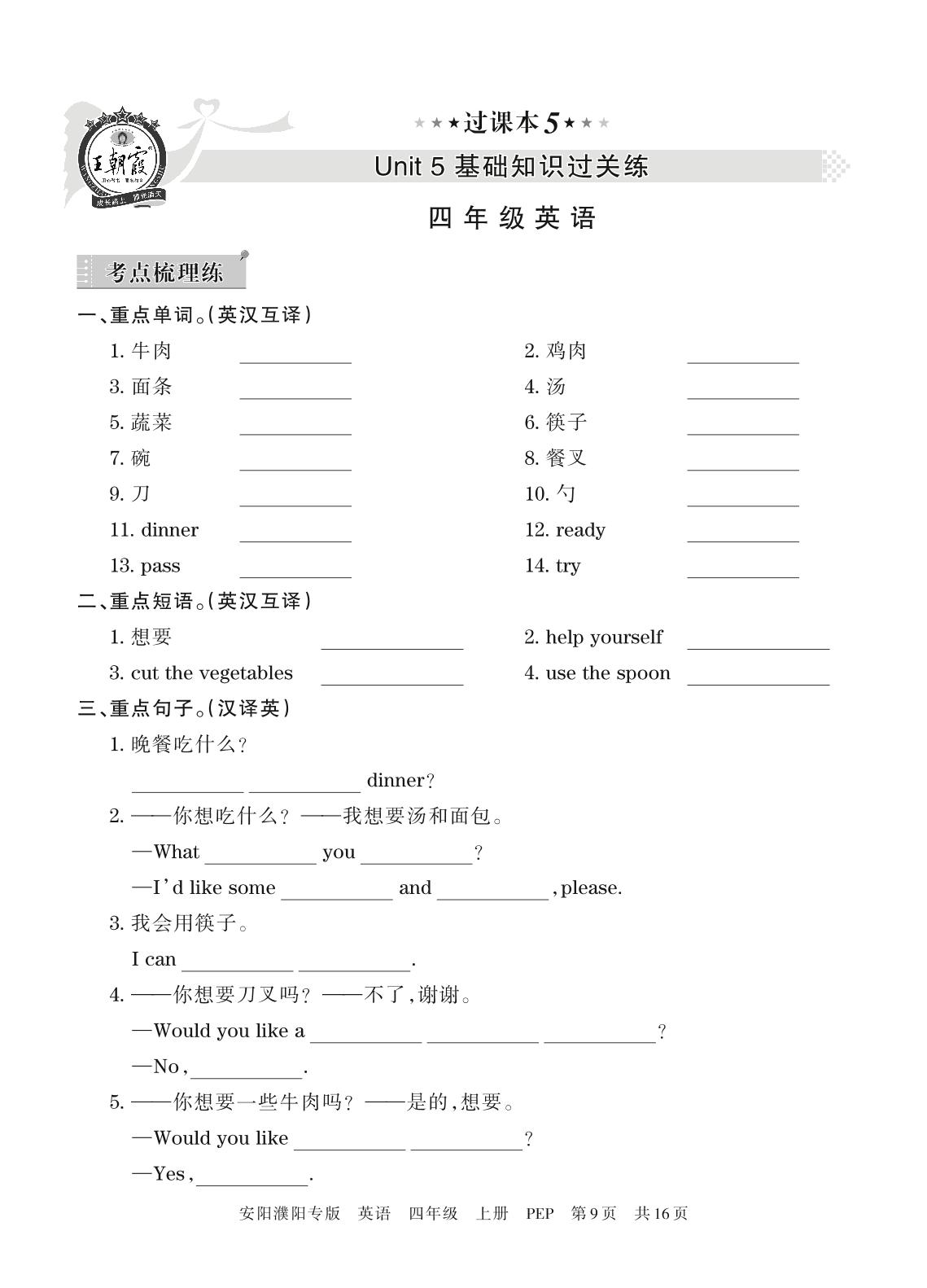 王朝霞期末过课本——Unit 5基础知识过关练四年级上册英语(人教PEP版)_R211223162154351【5】